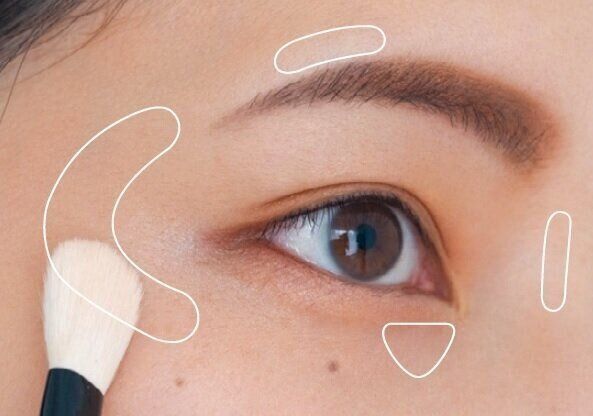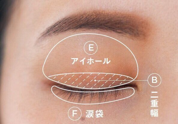目元はアイホール全体にEを、二重幅にBを重ねる。上まぶたのキワにCでラインを引き、そのまま目尻を囲むように下まぶた1/3まで伸ばす。涙袋にFをのせると華やかに仕上がる。