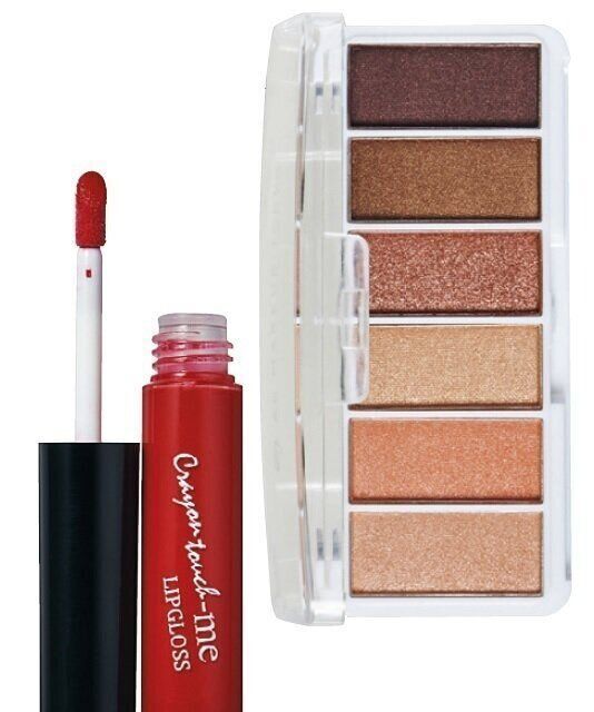 (右から)ナチュラルなのに温かみのある目元をつくるオレンジ~ブラウン系6色。重ねづけでも、単色使いでも◎。「AC 6カラーアイパレット」(05)、一度塗りでもリッチに発色。ふんわり染め上げ、つややかな唇に。「リップグロス」(ルビーレッド)各¥110(税込み)/キャンドゥ