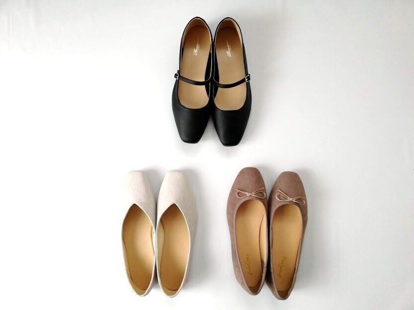 すこしスクエアがかったラウンドトゥがおしゃれ!ベーシックなバレエシューズながら、今っぽく見せてくれる1足。
