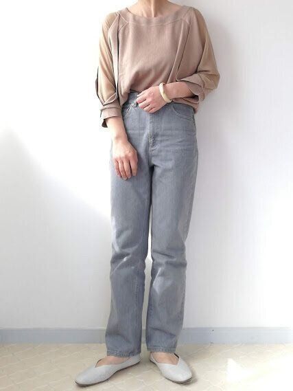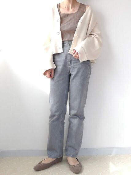 ホワイト・グレー・モカのニュアンスカラーでまとめたカジュアルコーデ。
