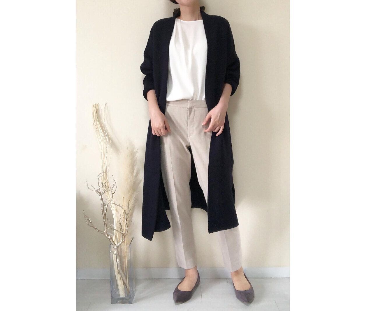 こちらは上のコーディネートのカーディガンをロング丈に変更しました。
