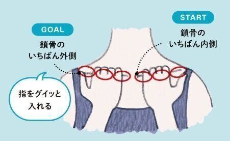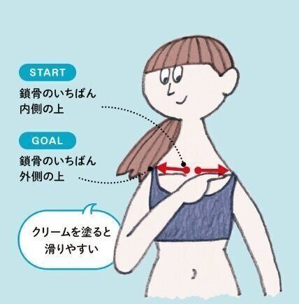 右手の人さし指を左鎖骨の上のくぼみに当てる。鎖骨に沿ってくぼみを掘り出すように外側に向かい何度もさする。右側も同様に行う。