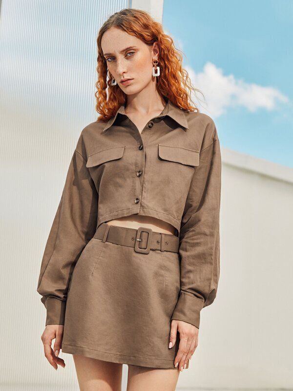 ショート丈のブラウンのリネンシャツ。同系色のショートパンツやスカートなどと合わせても統一感が出ておしゃれなコーデになります。脚長効果も期待できますね。
