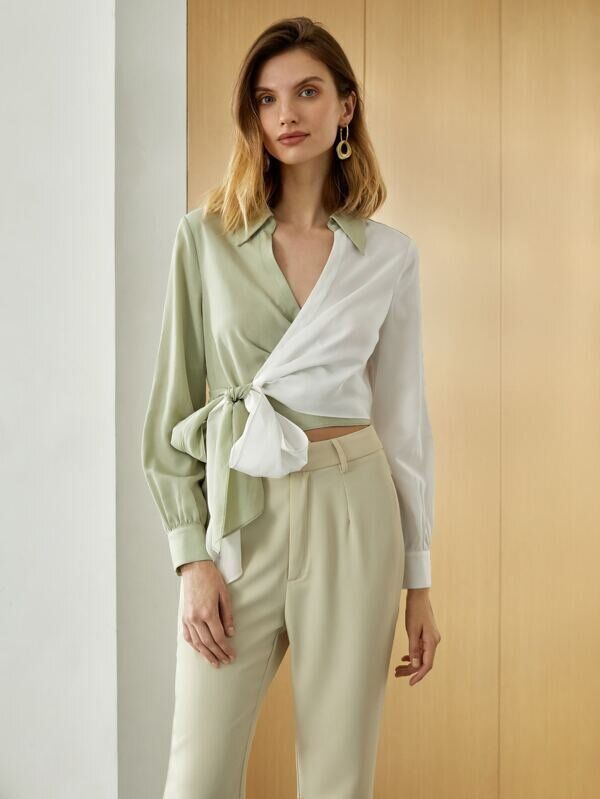 くすみグリーンとホワイトのリネンシャツ。目を惹くデザインなので、スッキリとパンツと合わせるのもおすすめ。ベージュのボトムスを選べばやわらかい印象になりますね。