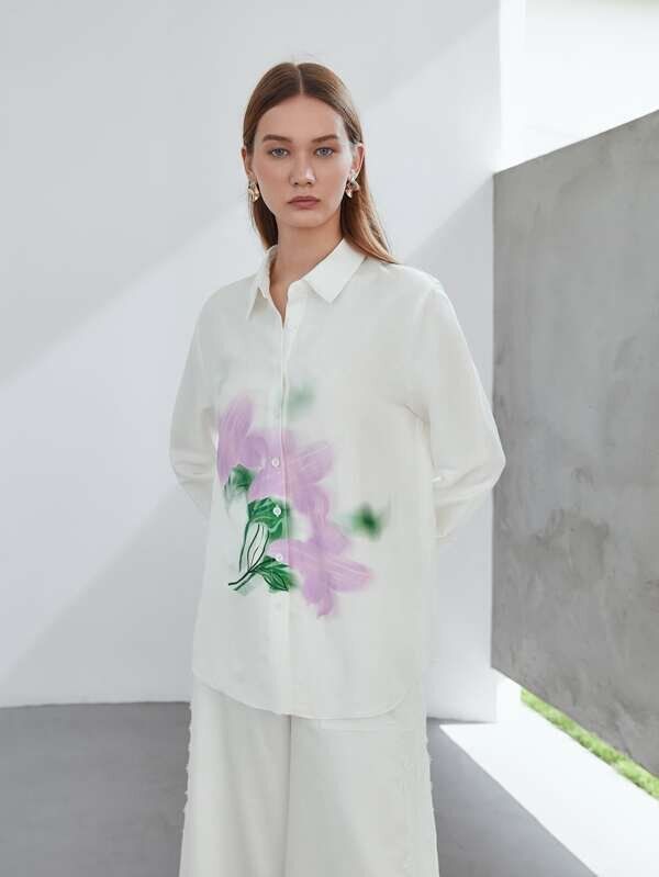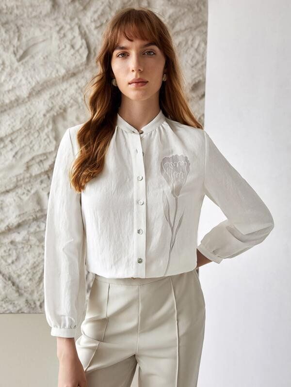 胸元のチューリップがアクセントになっている白いリネンシャツ。白いパンツと合わせれば、チューリップがさらに引き立ちます。オフィスコーデとしても活躍間違いなしですね。