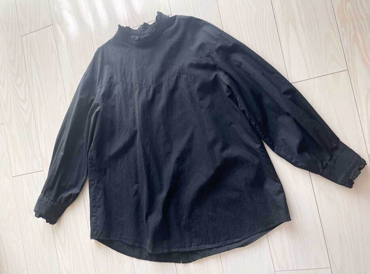 雑誌で良く見るフリルブラウスのスタイリングは、首元からチラリのぞく白のイメージが強かったんです。