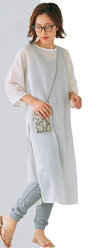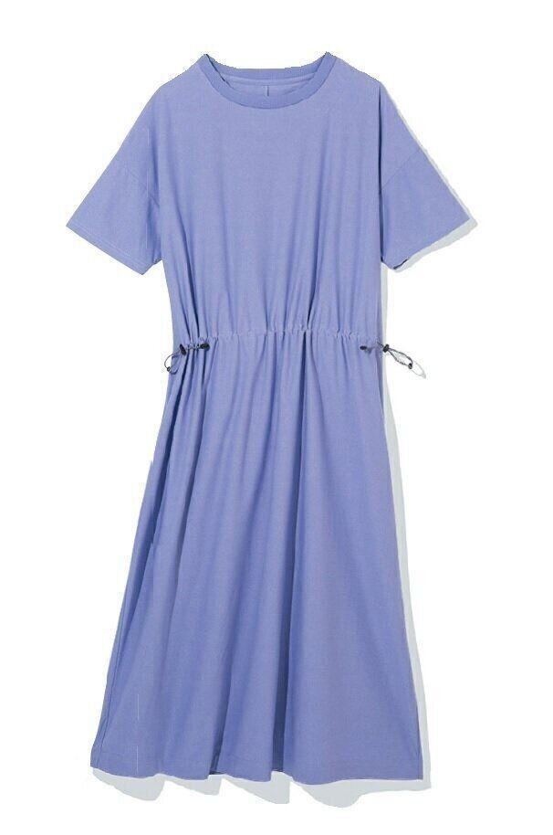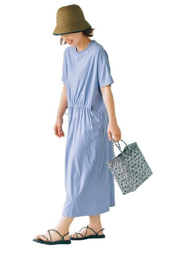 「ウエストのひもを絞るとシルエットが調整できるデザイン。1枚でサラッと着られ、顔映りのいい明るいカラーは、アラフォー世代の味方です」。