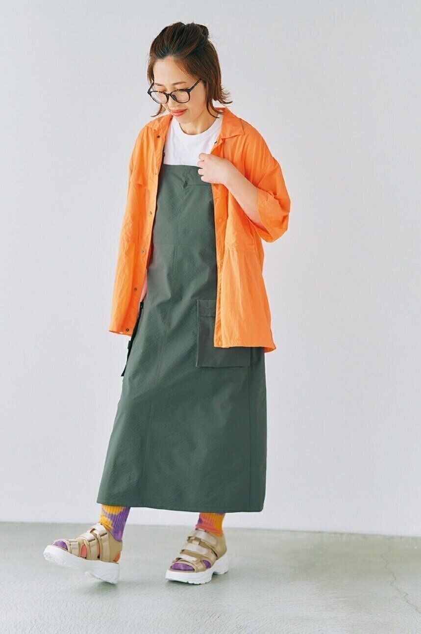 「リペアテック(R)超軽量×遮熱半袖オーバーサイズシャツ」¥1,900/ワークマン、Tシャツ/ユニクロ、靴下/ANONYMOUSISM、サンダル/GU