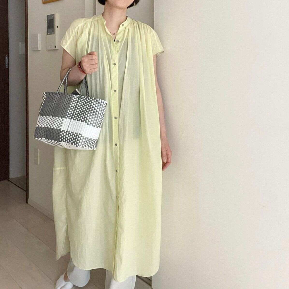 隠したいところはしっかり隠して、見せる部分はしっかり見せる、このメリハリこそがゆったりシルエットのワンピースを着こなすコツです。