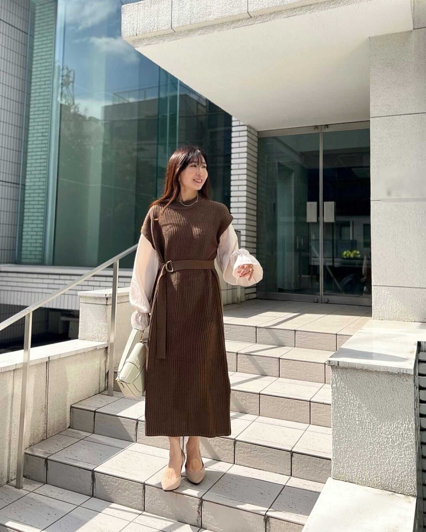 袖のドッキングデザインやウエストのベルトなど、随所にメリハリと見えるポイントを発見できる着痩せ絶大なワンピースがこちら。ニットワンピースを選ぶときは、細かなディテールまで要チェック。ウエストベルトつきだと、ニットワンピース特有のモコモコとした着ぶくれ感がなく、すっきりと着こなすことができます。