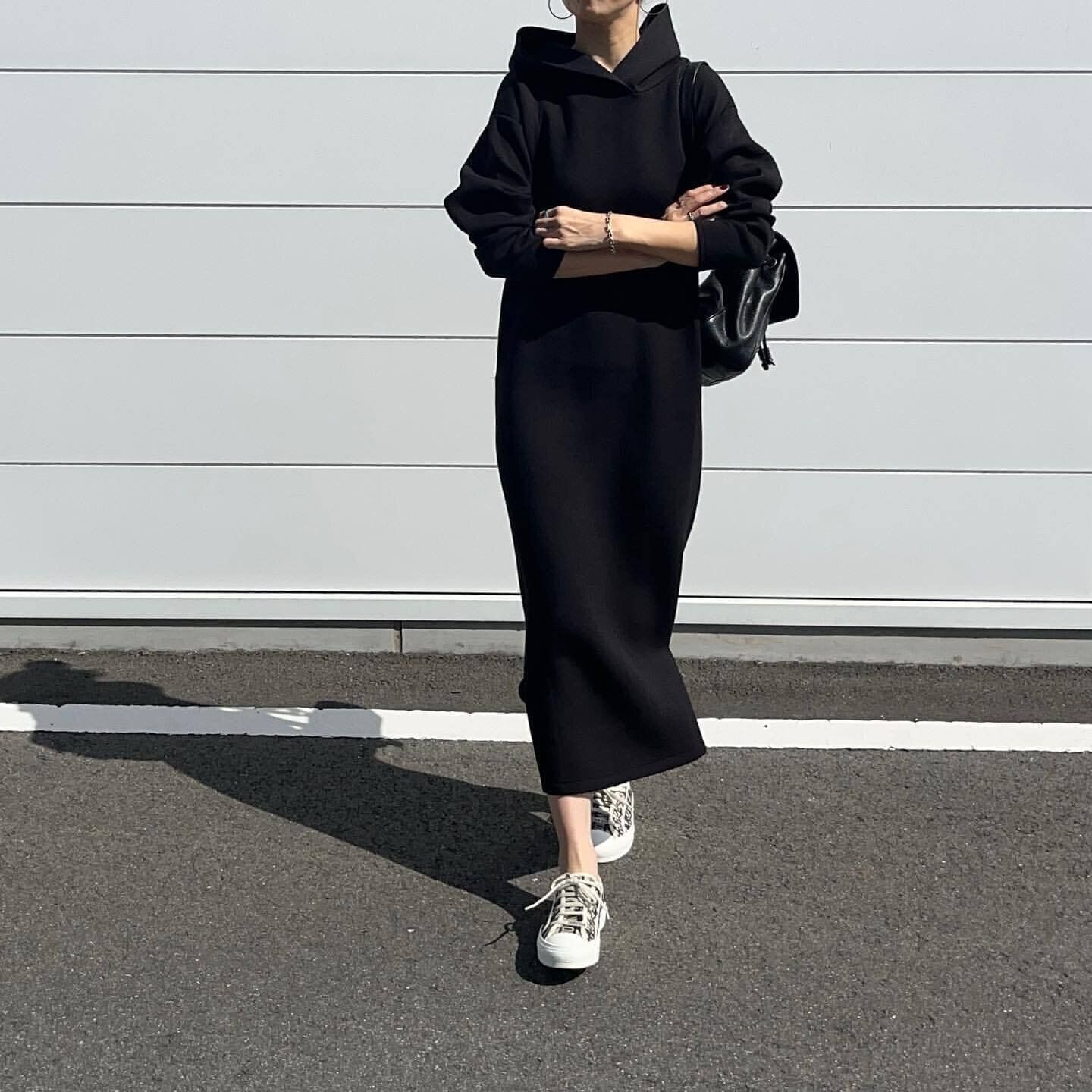 ラクに着られるスウェット素材のワンピースは、お腹が苦しいときに手に取りたくなるアイテム。手抜き感のあるカジュアルコーデになりがちなアイテムですが、素材を厚手のものにするだけで洗練されて見えますよ。フードつきの場合は、フードの立ち上がり具合をチェックしてみて。