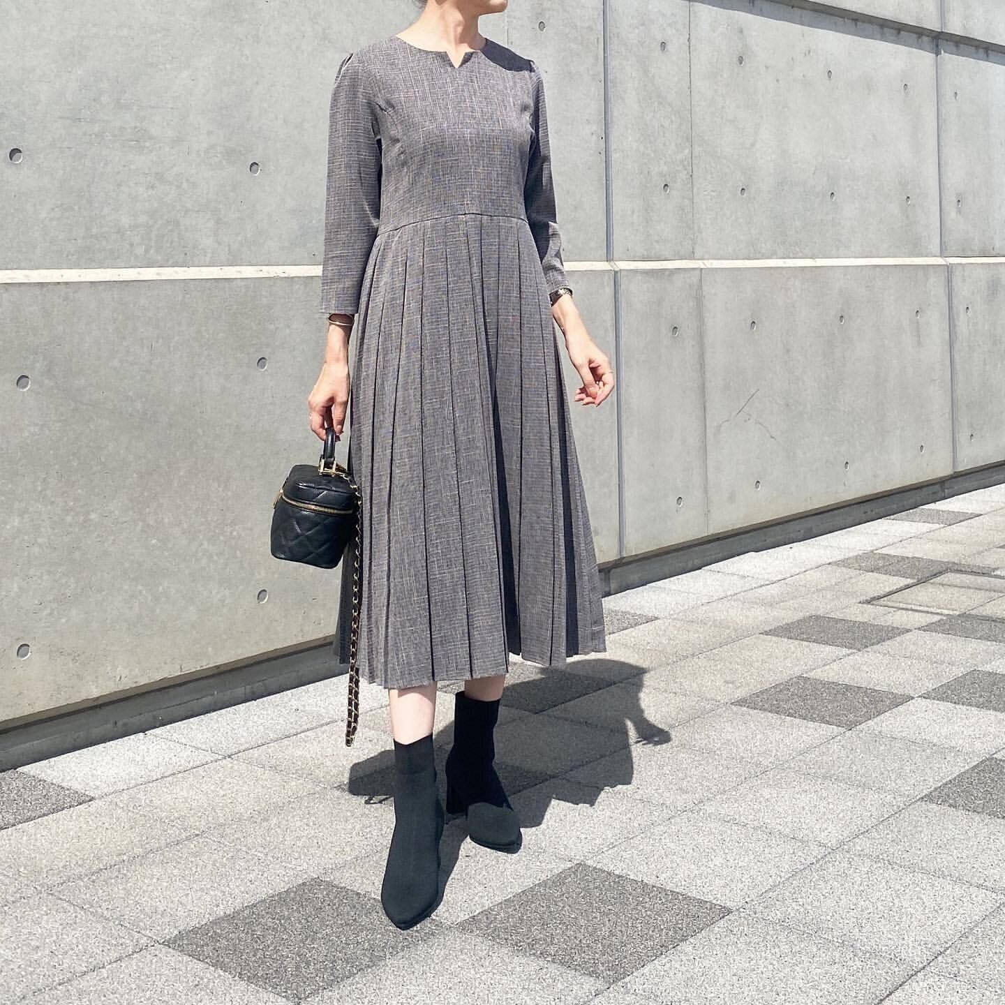 プリーツの縦ラインでウエスト・ヒップラインが悪目立ちしないワンピースもおすすめ。上品さがにじみ出るので、きちんとしたいシーンでも活躍できそう。流行を問わず、体形を気にせずに着やすいワンピースを持っておくと飽きずに長く着続けることができますよ。