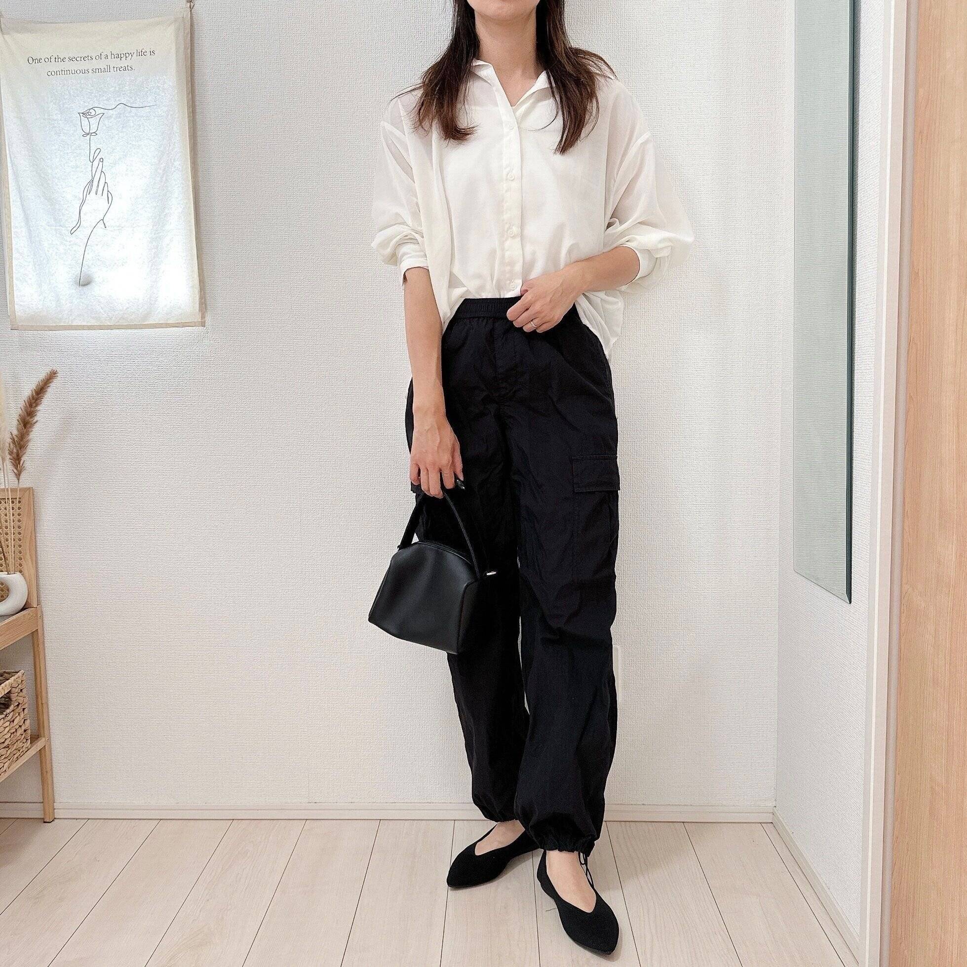 次はトレンドのシアーシャツとカーゴパンツに合わせてみました。カーゴパンツにスニーカーを合わせるとカジュアルすぎて悩んでいたコーデもこのフラットシューズなら女性らしい大人カジュアルコーデに仕上がりました。