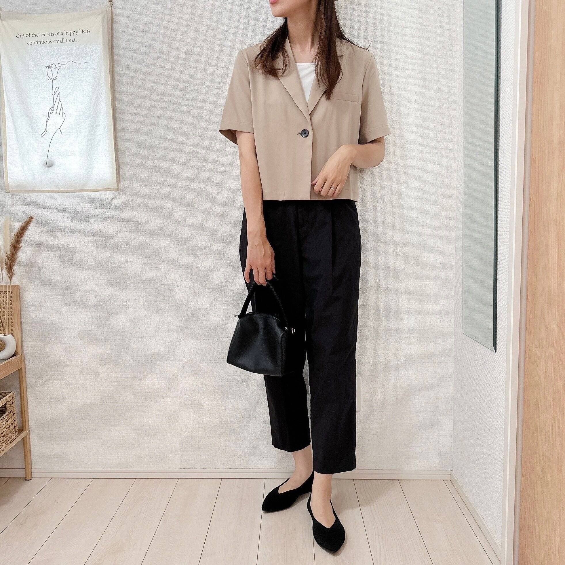 まずは半袖のジャケットとテーパードパンツのお仕事コーデに合わせてみました。ニット素材ですが、カジュアルな印象ではなくきれいめにみせてくれるのでお仕事用にもピッタリです。
