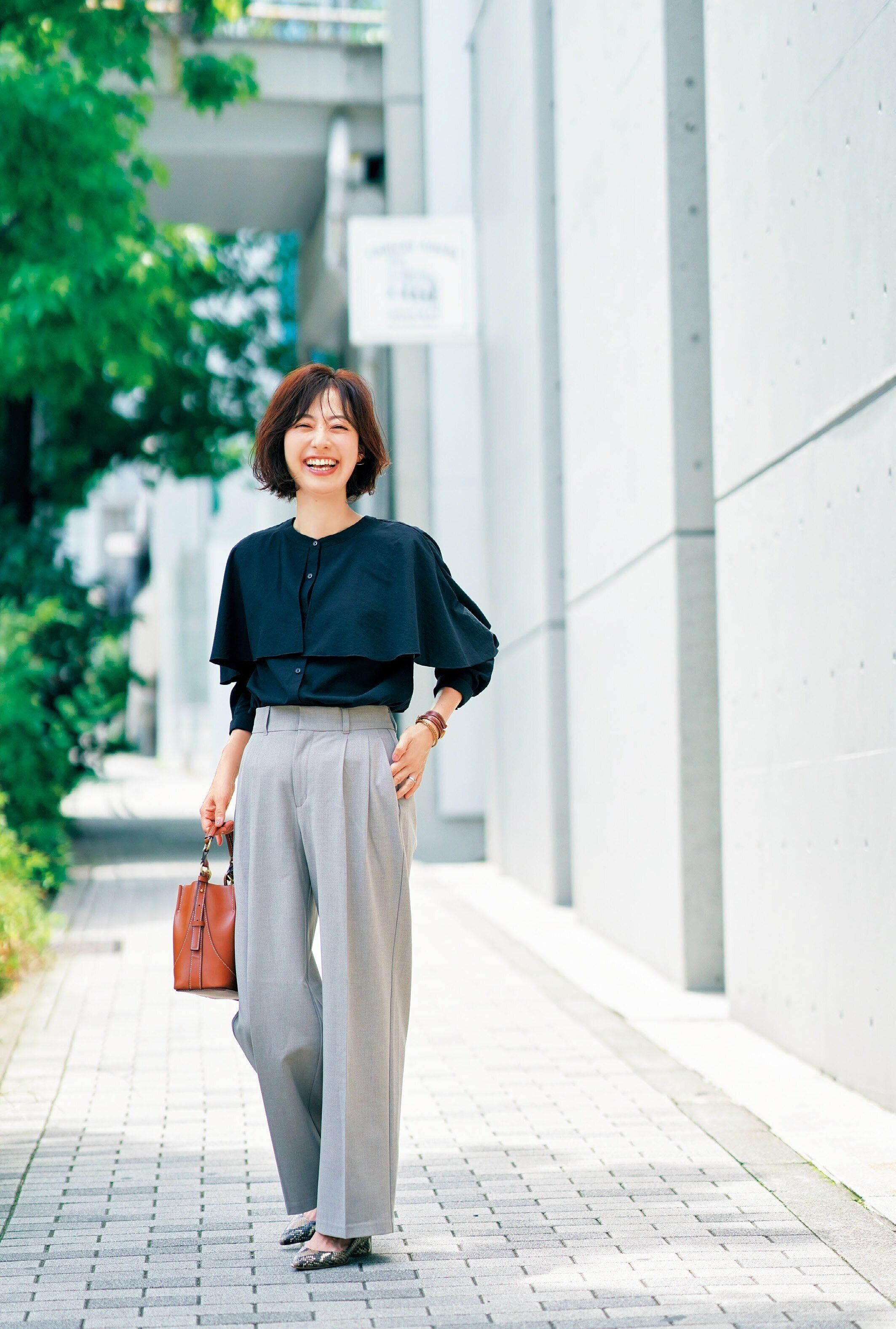 定番のレギュラー襟のシャツはどんなボトムにも合うけれど、40代が着るとコンサバすぎてちょっと古い印象に。襟がケープのように大きいデザインは、意外と大人も着こなしやすく、ワンランク上のおしゃれが実現します。