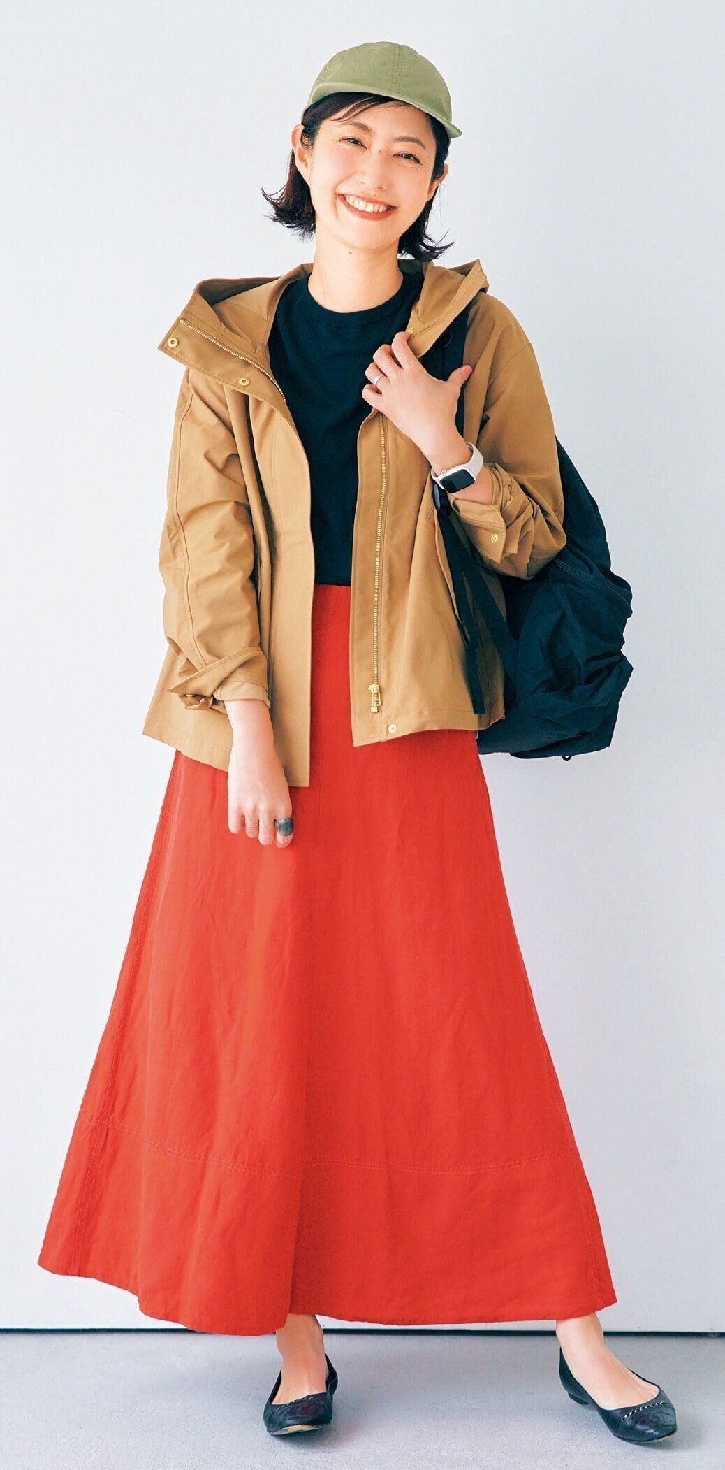秋口から活躍するパーカは、ジャストで着られる丈感でスカートにもパンツにも合わせやすい。つや感のある生地も◎。