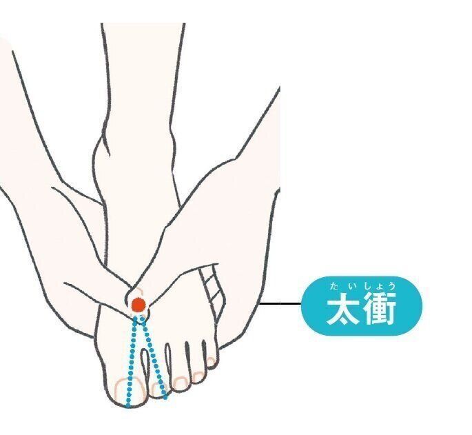 足の甲の親指と人さし指の骨が交差するくぼみの部分。特に冷え症の人は、この部分が冷たく感じる場合があります。奥に太い血管が通っているのでここを刺激すると、血流がアップし、上半身まで温まります。