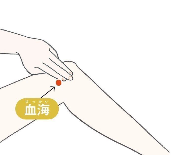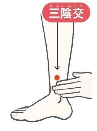 足の膝上、内側の角(くぼみ)から指3本分上。「血」は血流、「海」は大量に集まる場所という意味で、血流に関わる不調に効果があります。冷え解消のほか、月経不順や膀胱炎などの改善も期待できます。