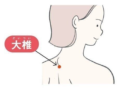 肩甲骨の上部の間。首の付け根で出っ張っている骨のすぐ下のくぼみから背骨2つ分下がり、左右の外側に指2本分のところ。温めることで体全体の血流が良くなり、風邪の予防に効果があります。