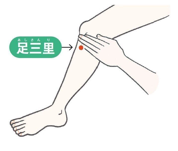 膝の皿の外側のくぼみから、指4本分下。両手の親指をあてて押すと、刺激が入りやすくなります。胃腸などの消化器系の不調を整える働きがあるとされていて、内臓を温める効果もあります。