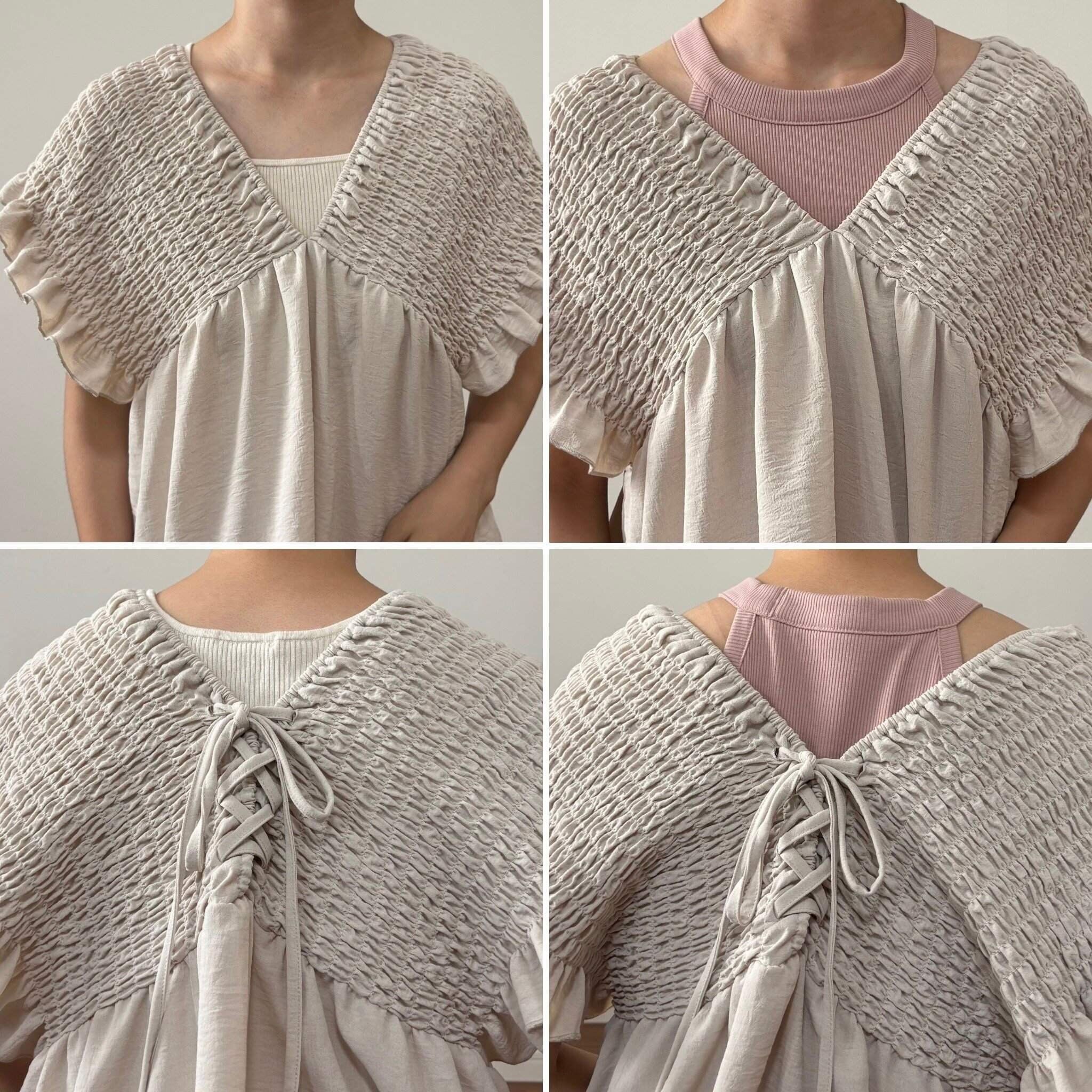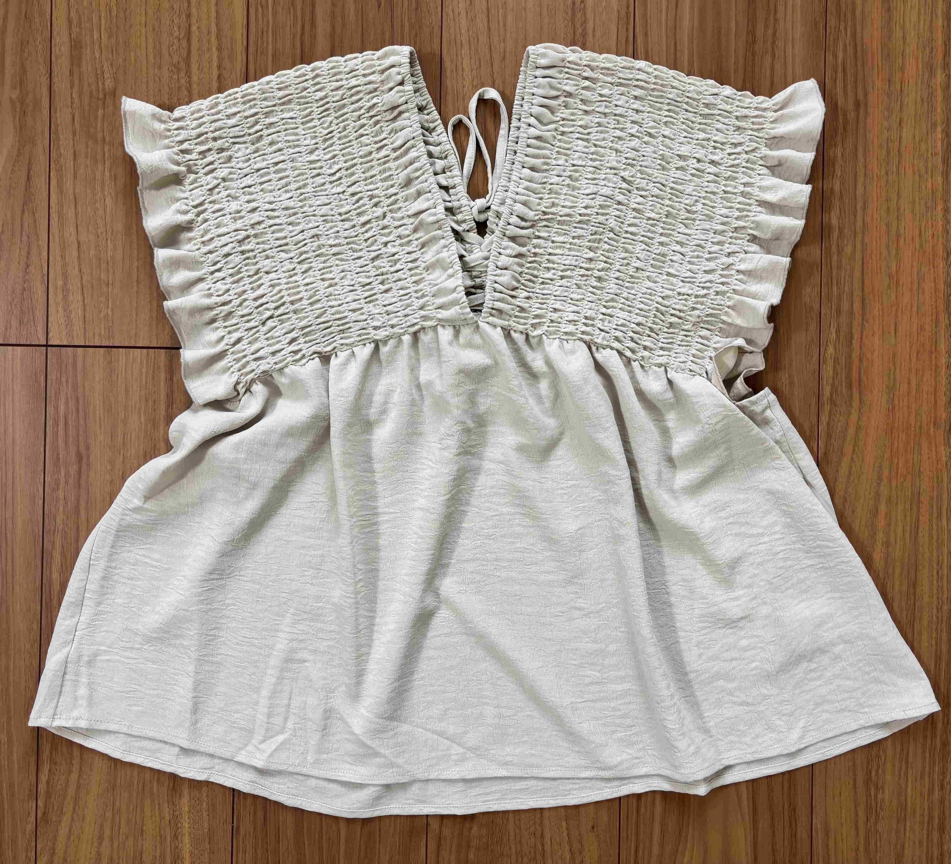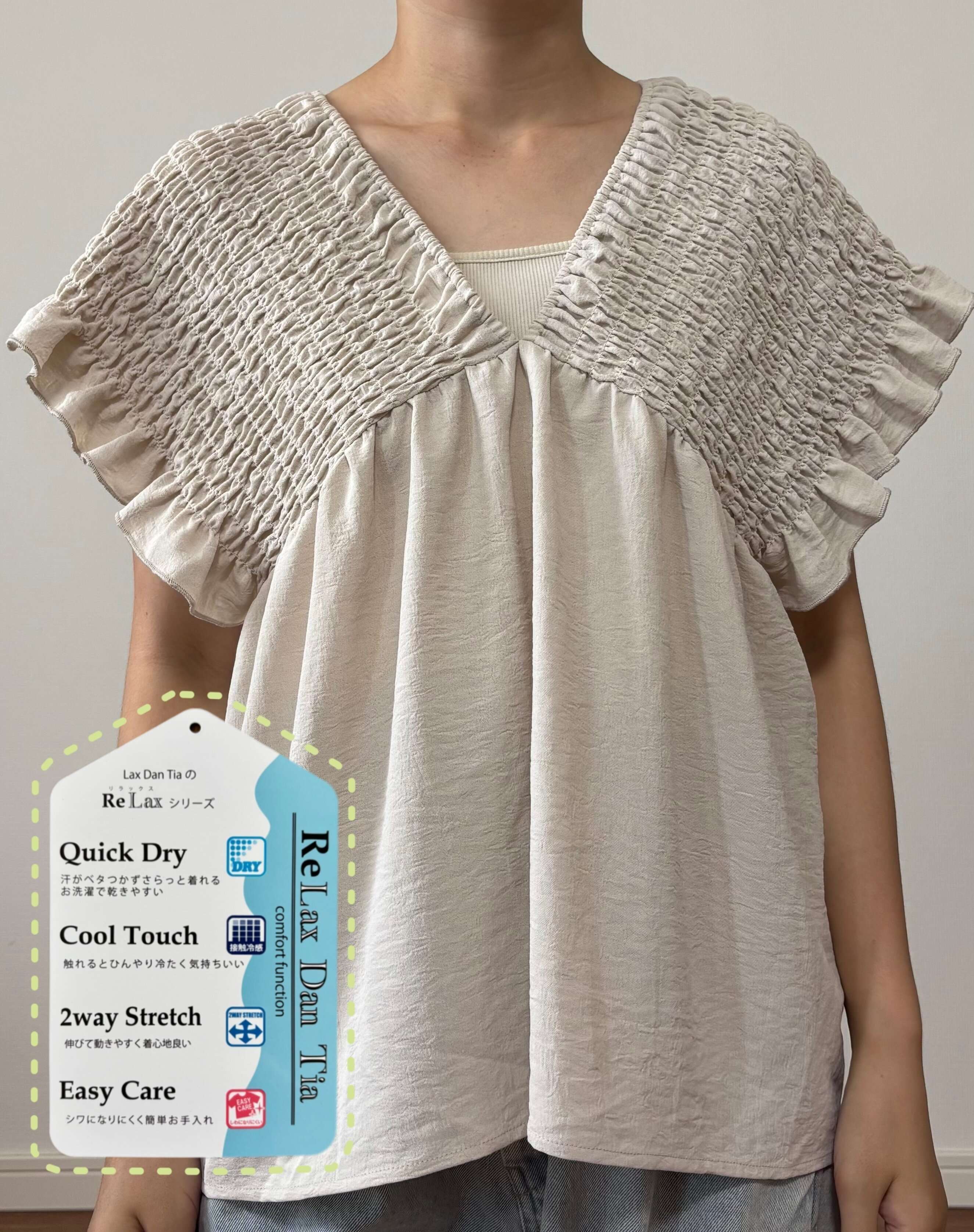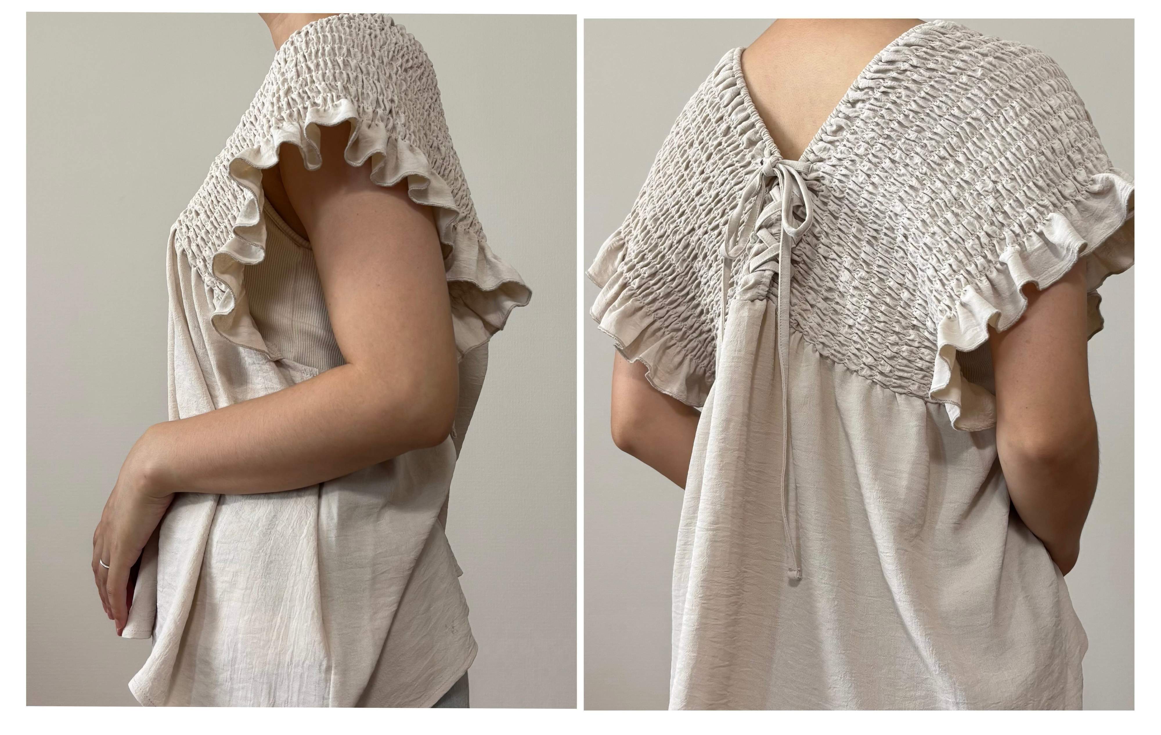 今回ご紹介するのはこちらの肩シャーリングのトップスです。