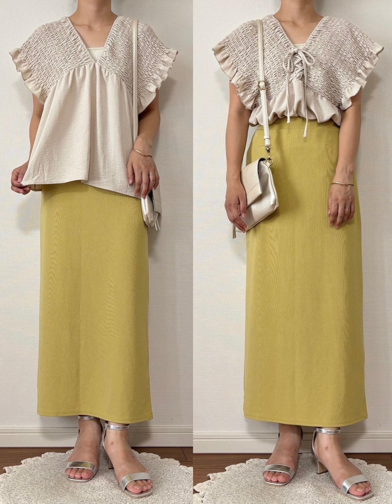 こちらのトップスは胸下から広がるふんわりシルエットでお腹周りを隠しつつ、デコルテを見せてメリハリを出すことで華奢な印象にみせてくれますよ!