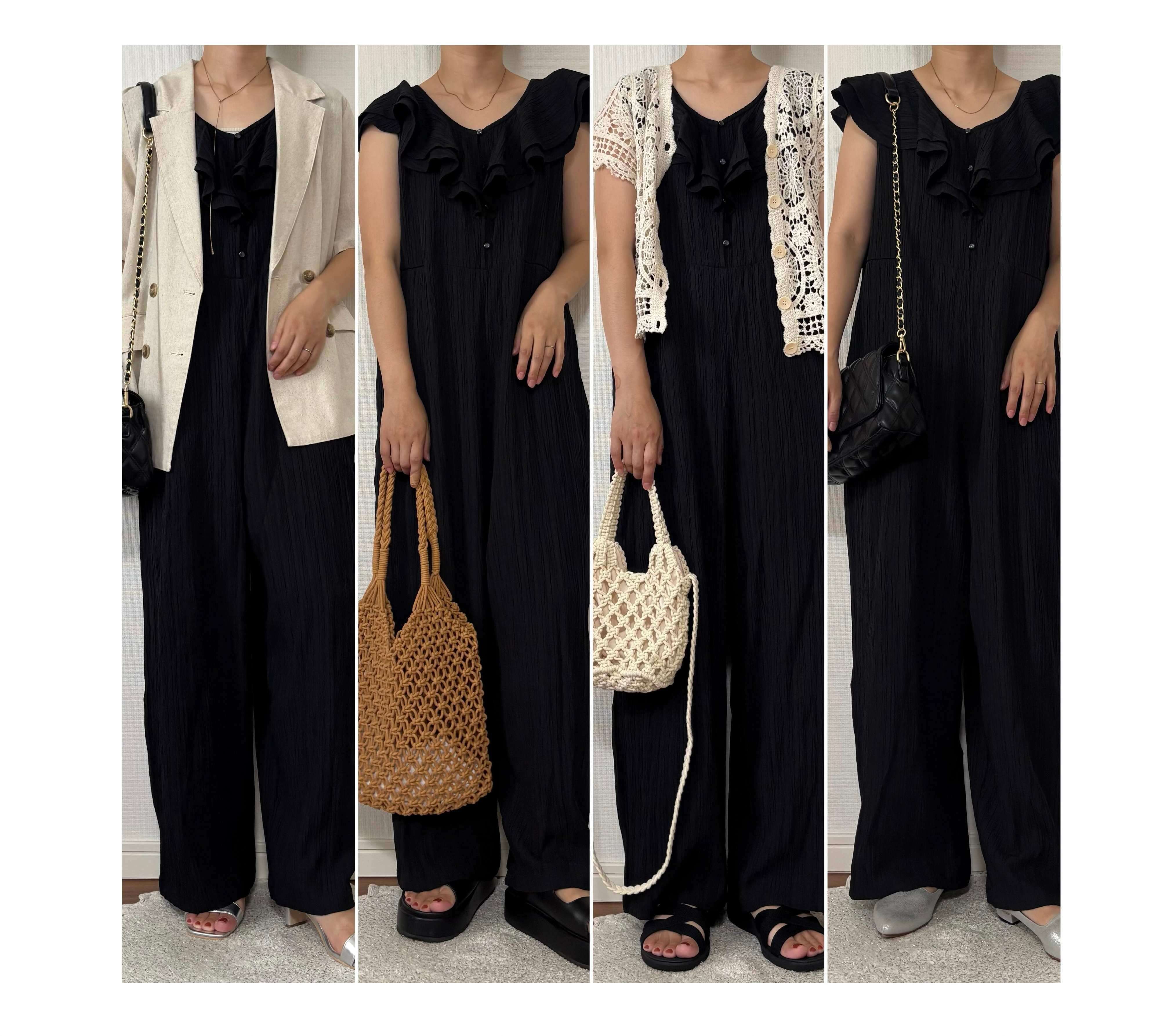 大人ブラックのオールインワンは、小物を変えることで全体の印象もがらりと変わります。