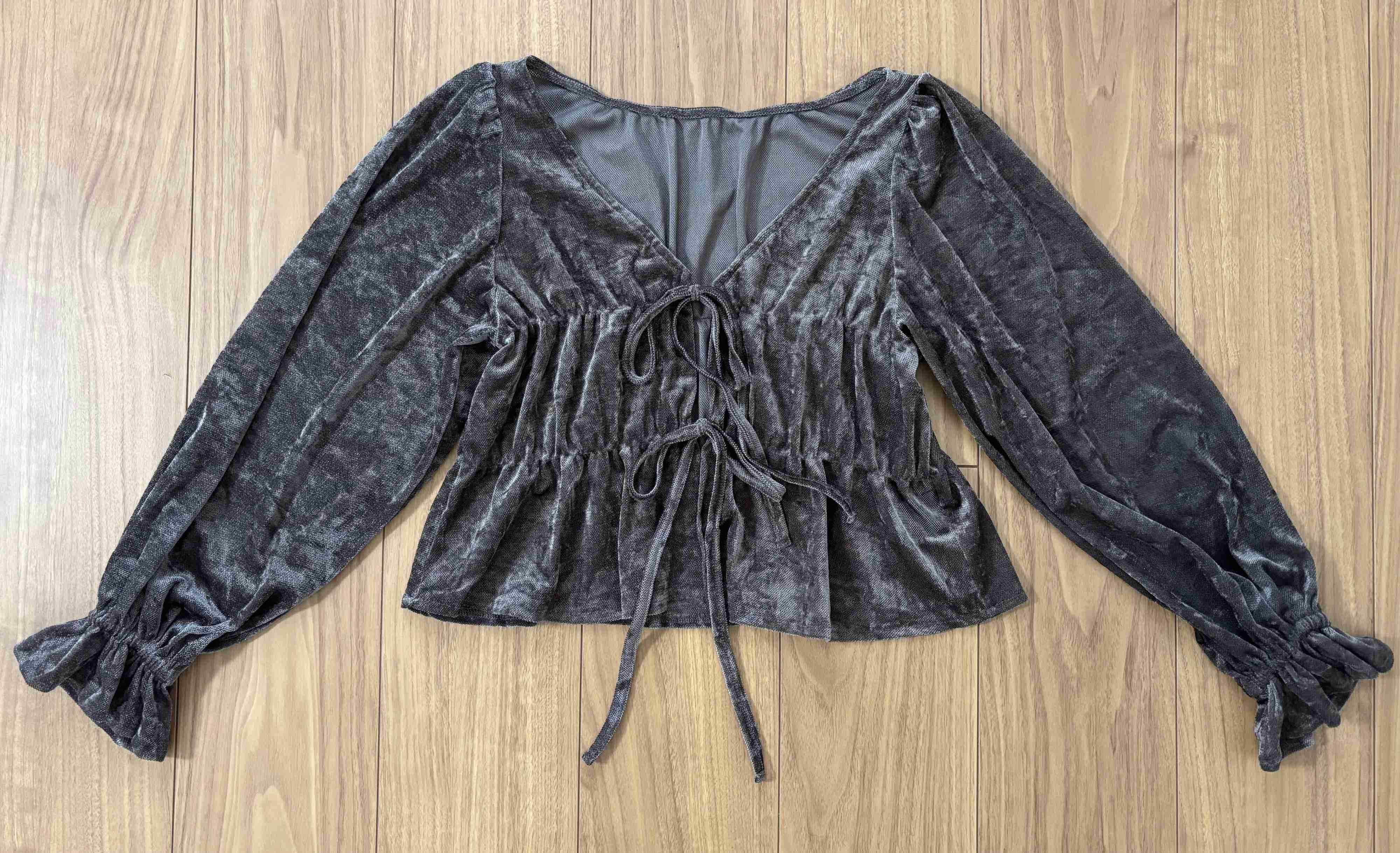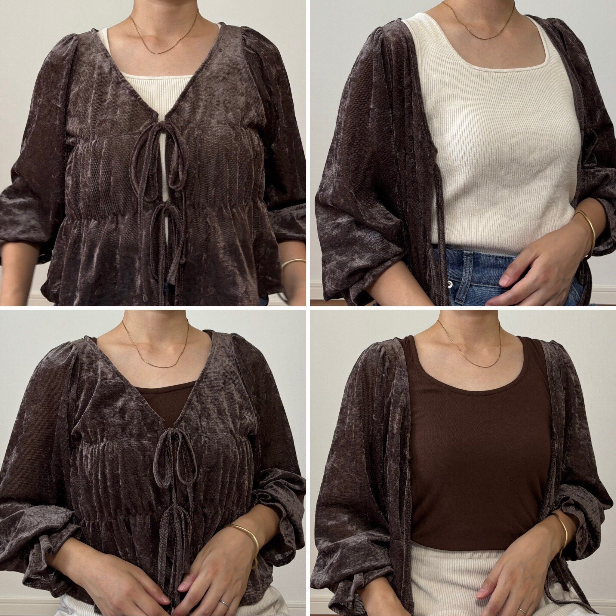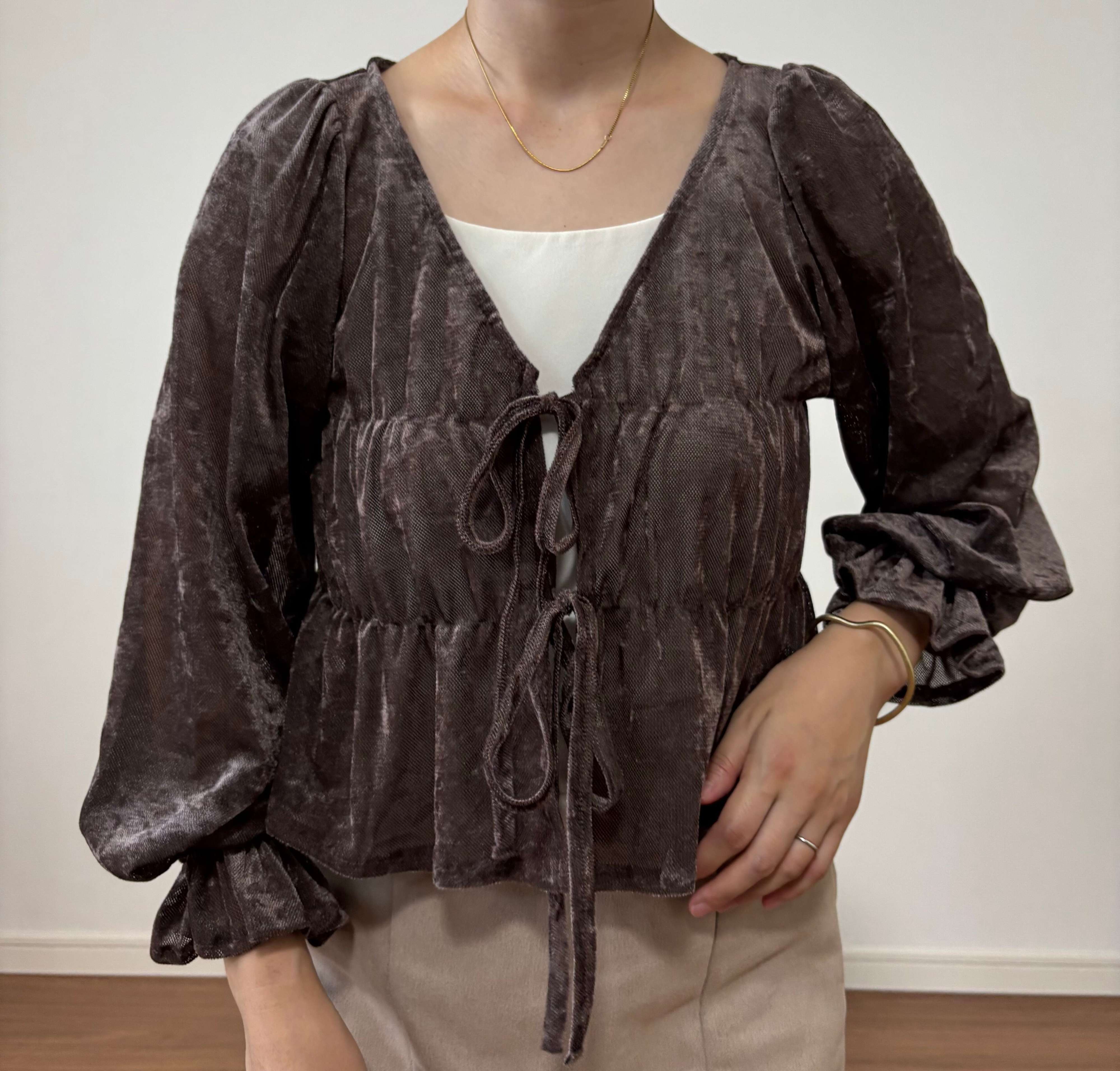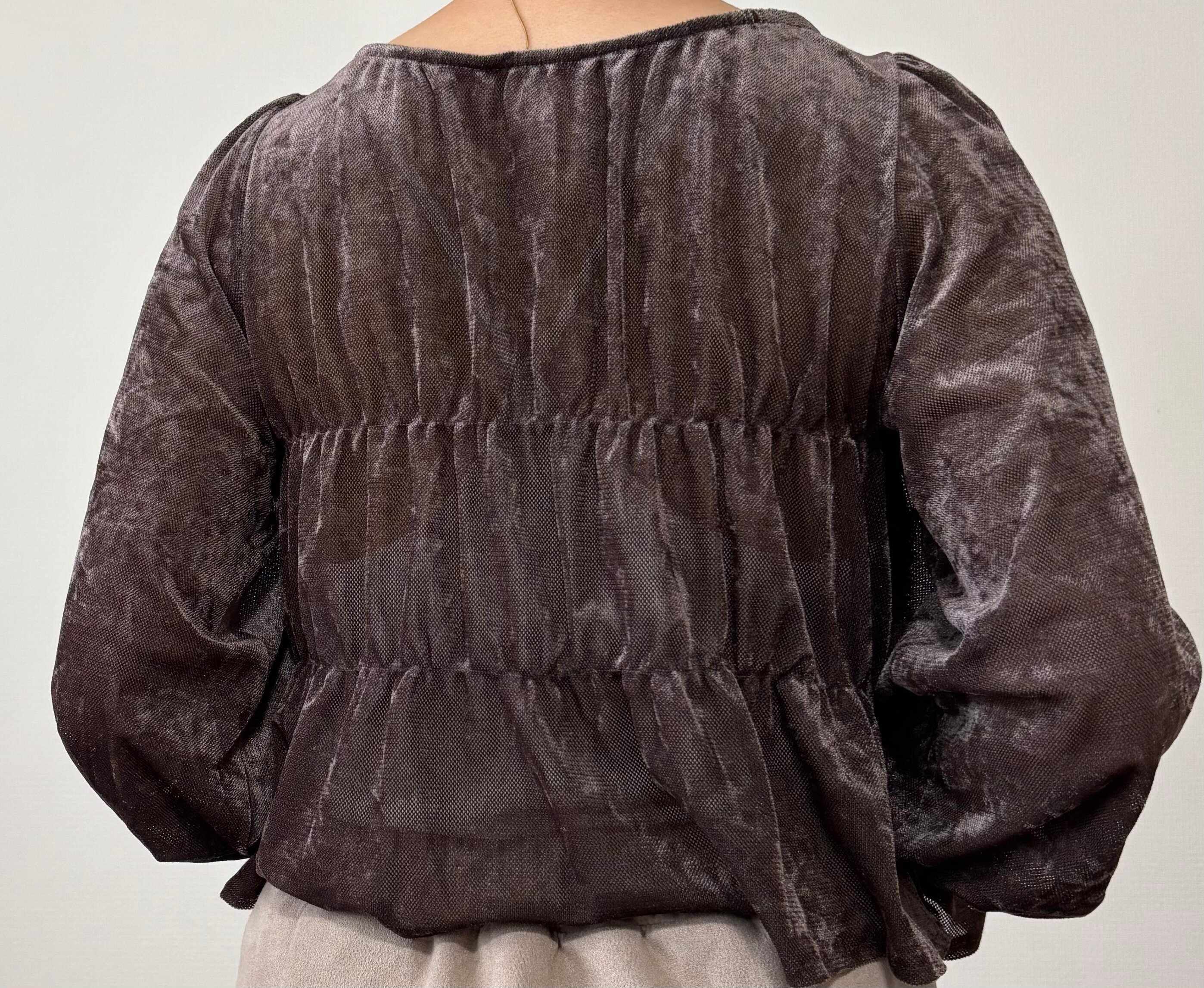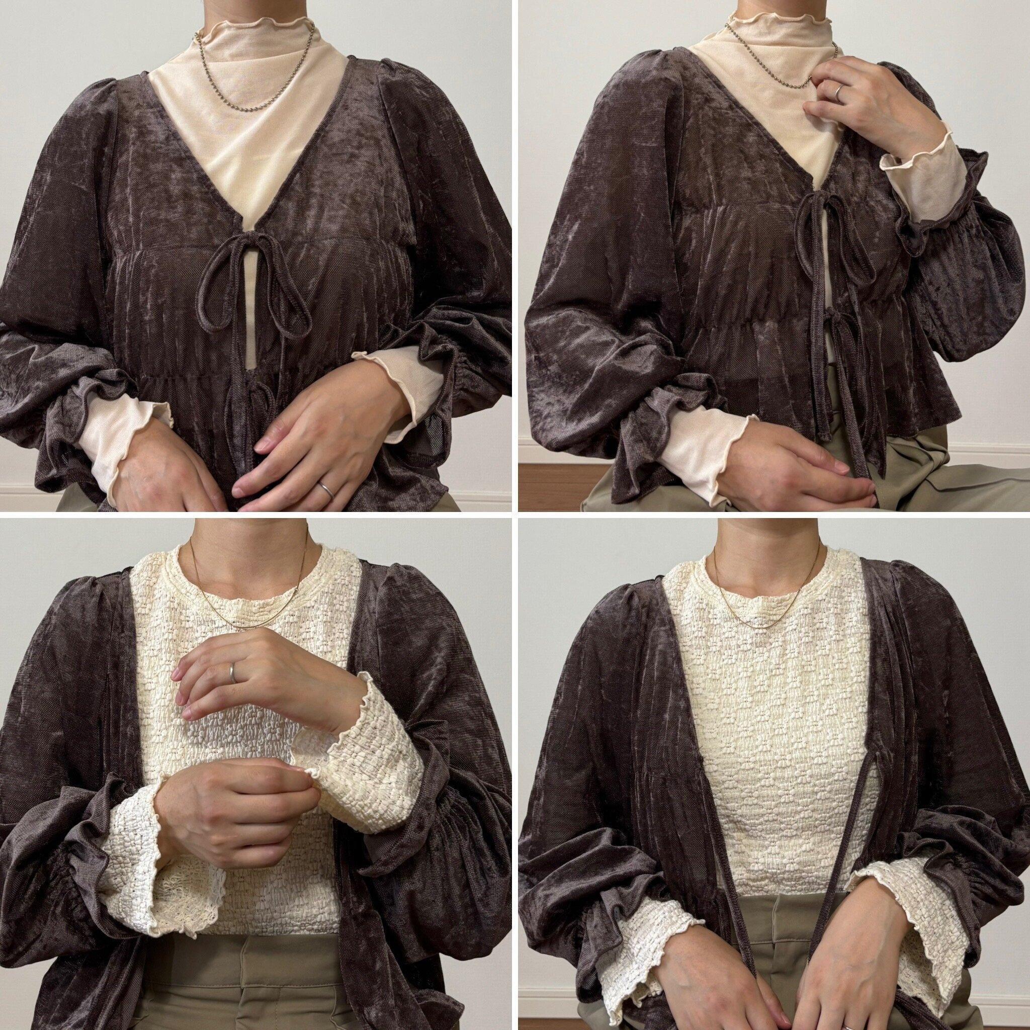 今回ご紹介するのは袖がキャンディースリーブになったショート丈のシアーベロアカーディガンです。