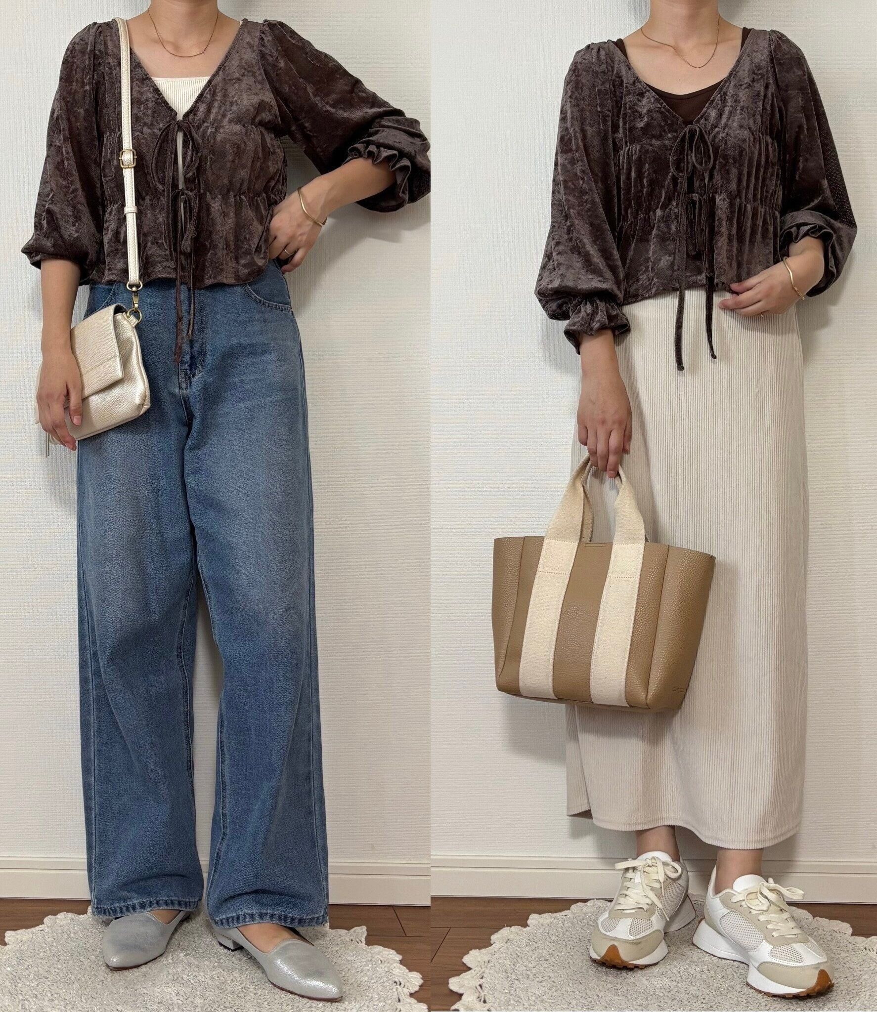 甘めのデザインなので大人女子はデニムやスニーカーでカジュアルダウンするコーディネートもおすすめです。