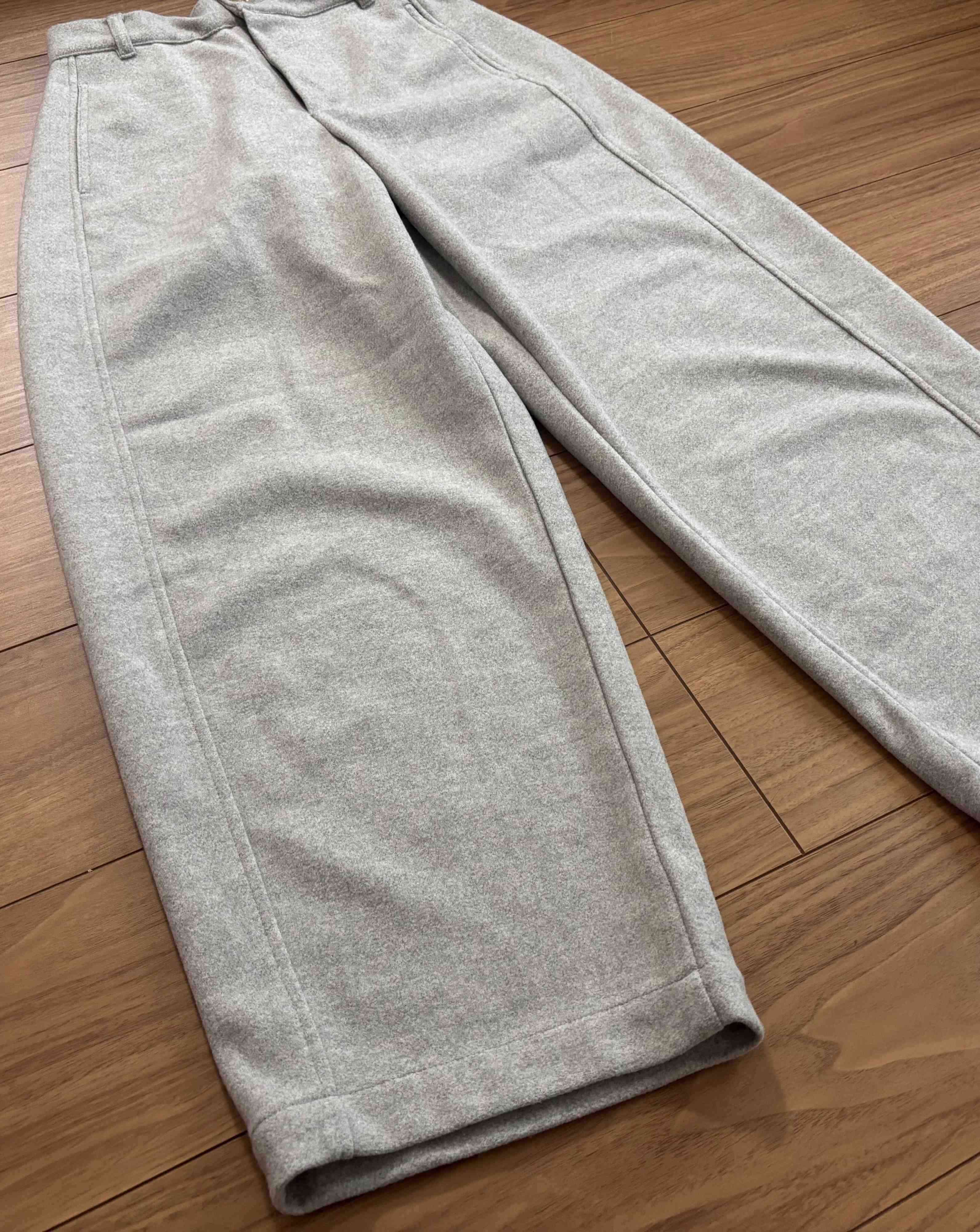明るめのグレーでカジュアルなスウェットパンツのようにも見えますが、生地が厚みのあるしっかりした素材なのでカーブシルエットがとても綺麗に出ます。