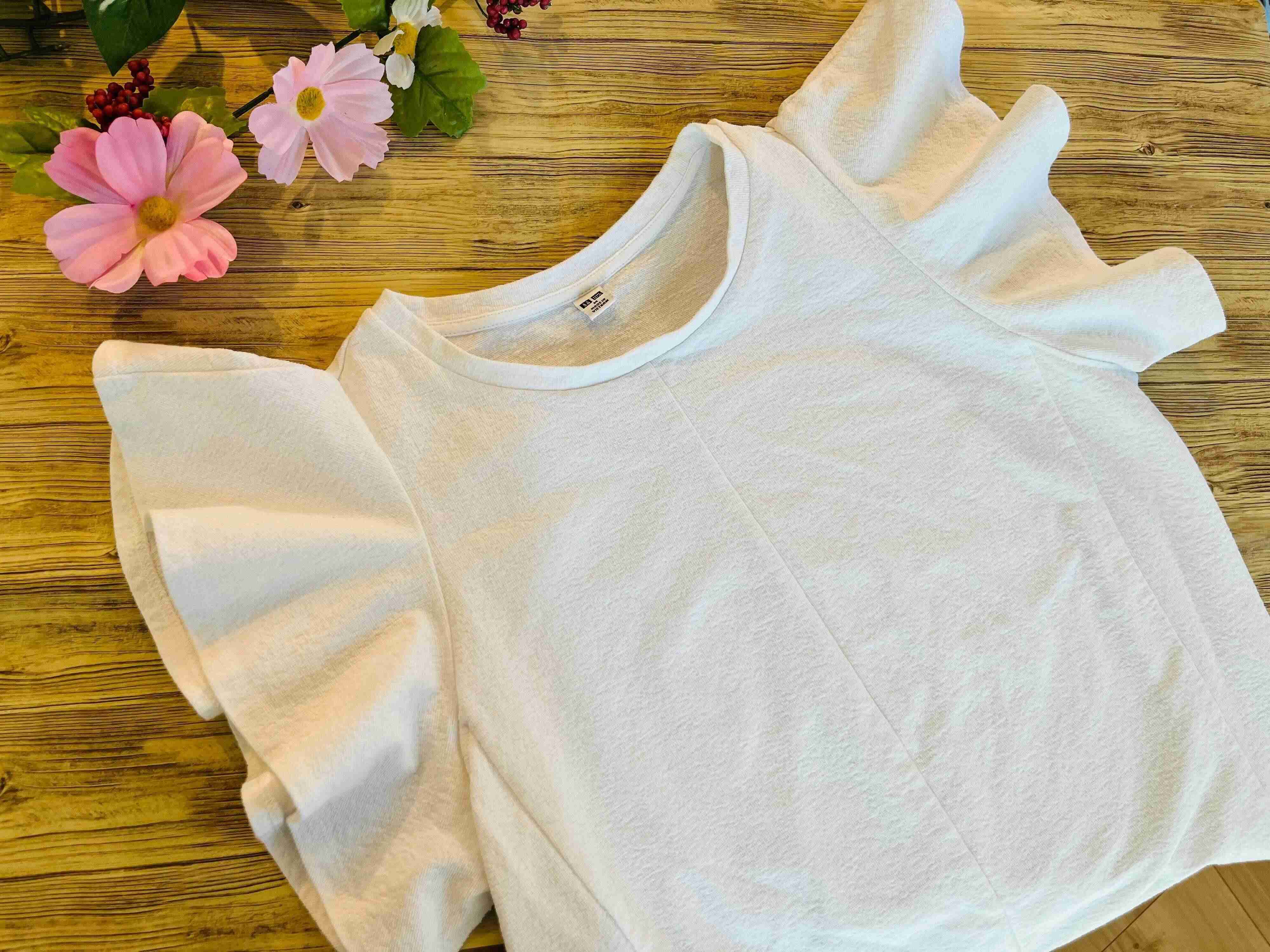 自分の手持ち服と合わせても着回しが効くこのラッフルスリーブT。