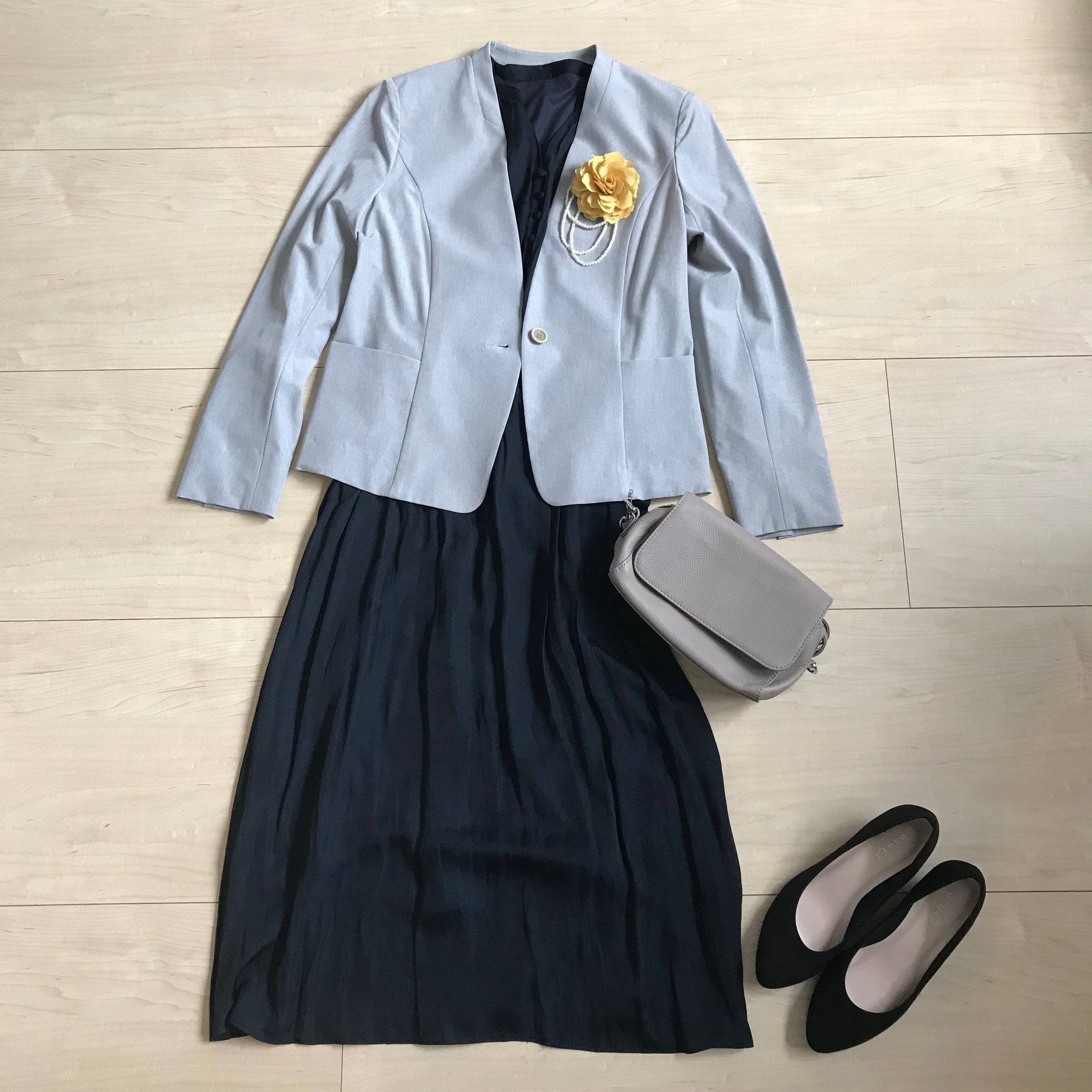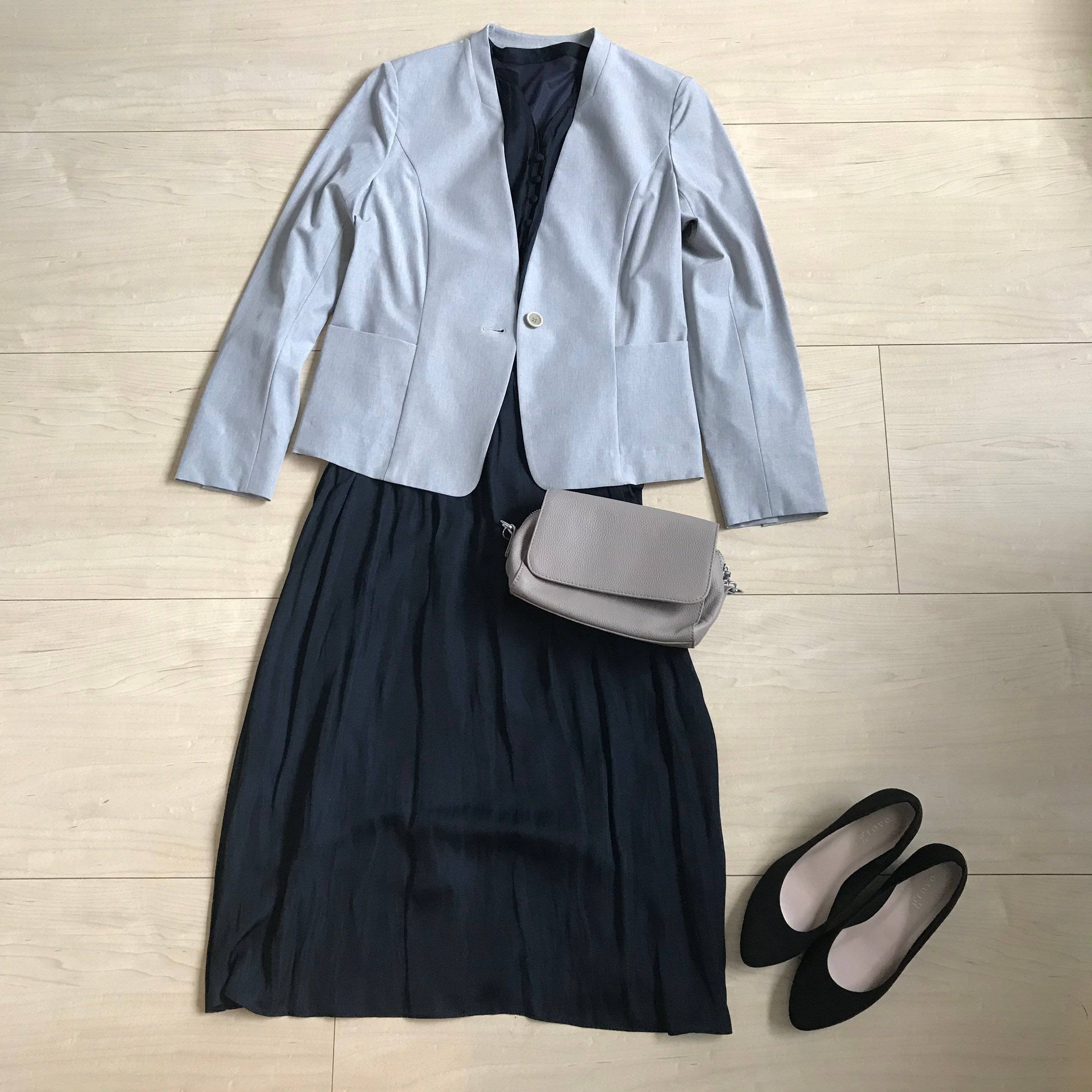 シンプルなネイビーのワンピース、ライトグレーのジャケットを合わせました。