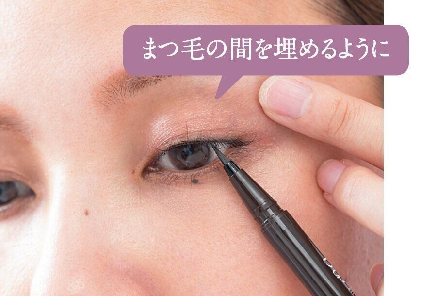 ポイントは、黒よりきつくならず、引き締め効果のある焦げ茶のリキッドアイライナーを選ぶこと。まぶたを引き上げながら、黒目の真上だけにラインを引いて、さりげなく目力UP!