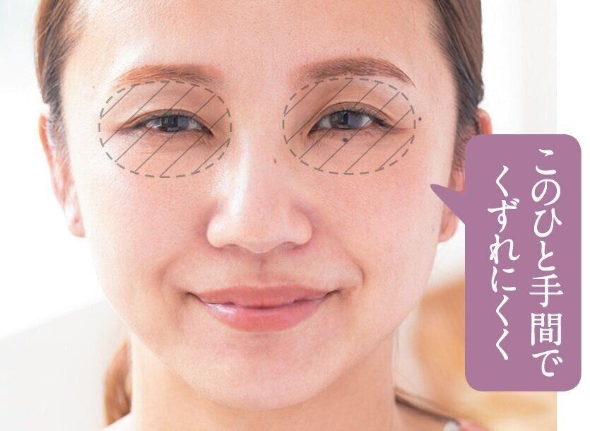 意外とベタつきやすく、メイクくずれしやすい目元。サラサラに整えるタイプの部分用下地を塗っておくと、アイカラーの発色やもちがアップ。目元をぐるっと囲むように塗布して。