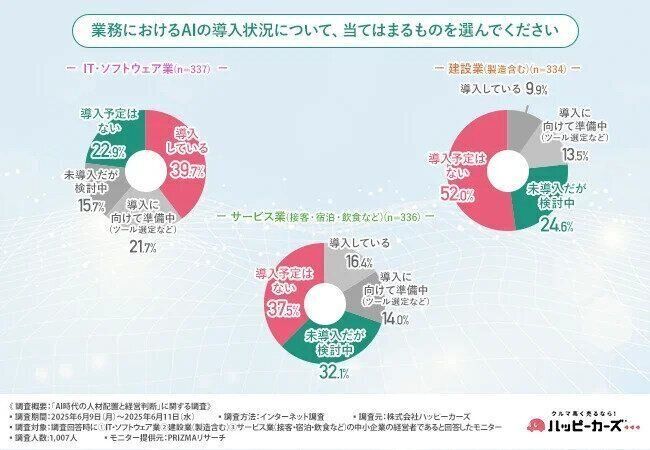 車買取り専門店の株式会社ハッピーカーズは、IT・ソフトウェア業・建設業(製造含む)・サービス業(接客・宿泊・飲食など)の中小企業の経営者を対象に、「AI時代の人材配置と経営判断」に関する調査を実施しました。