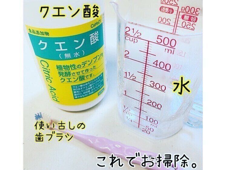 掃除をする為にクエン酸水を作ります。 紙コップに水50mlを入れて、クエン酸を1g入れます。歯ブラシでくるくる回して溶かします。これで完成です。1分もあれば作れます。