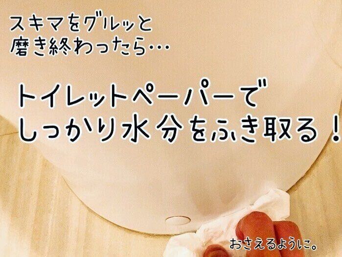 隙間を磨き終えたら、クエン酸水を拭きとります。トイレットペーパーでゴシゴシ拭くと、トイレットペーパーが破れて細かいゴミが隙間に入り込んでしまいます。そうならない為にも、トイレットペーパーで押さえるようにして水分を吸い上げていきます。
