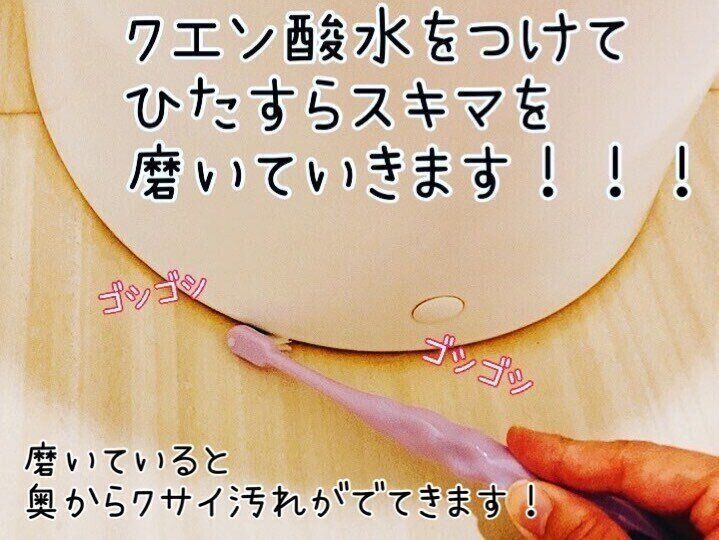 歯ブラシにクエン酸水をつけて、ひたすら隙間を磨いていきます。便器の奥側から磨き始めて、最後に手前を磨くような流れで作業を進めていきます。