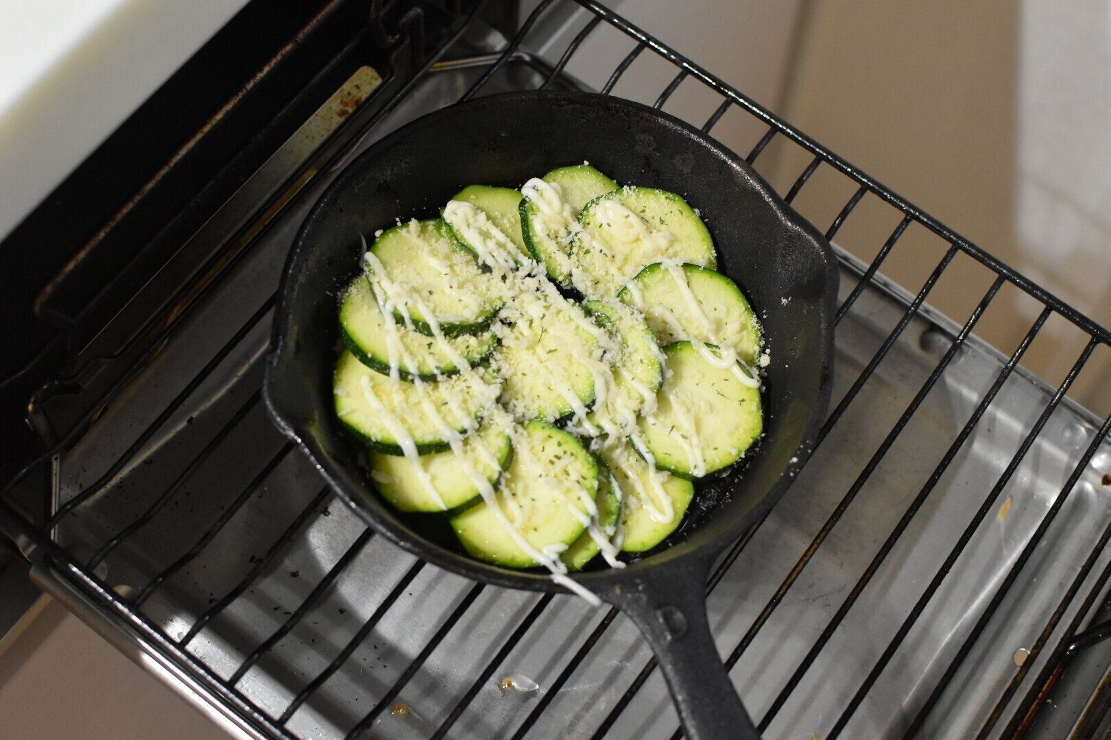 スキレットやグラタン皿に乗せるとそのまま食卓へ出すこともできます。マヨネーズのうま味があっさりとしたズッキーニのおいしさを引き立てて、シンプルにおいしい1品になりました。