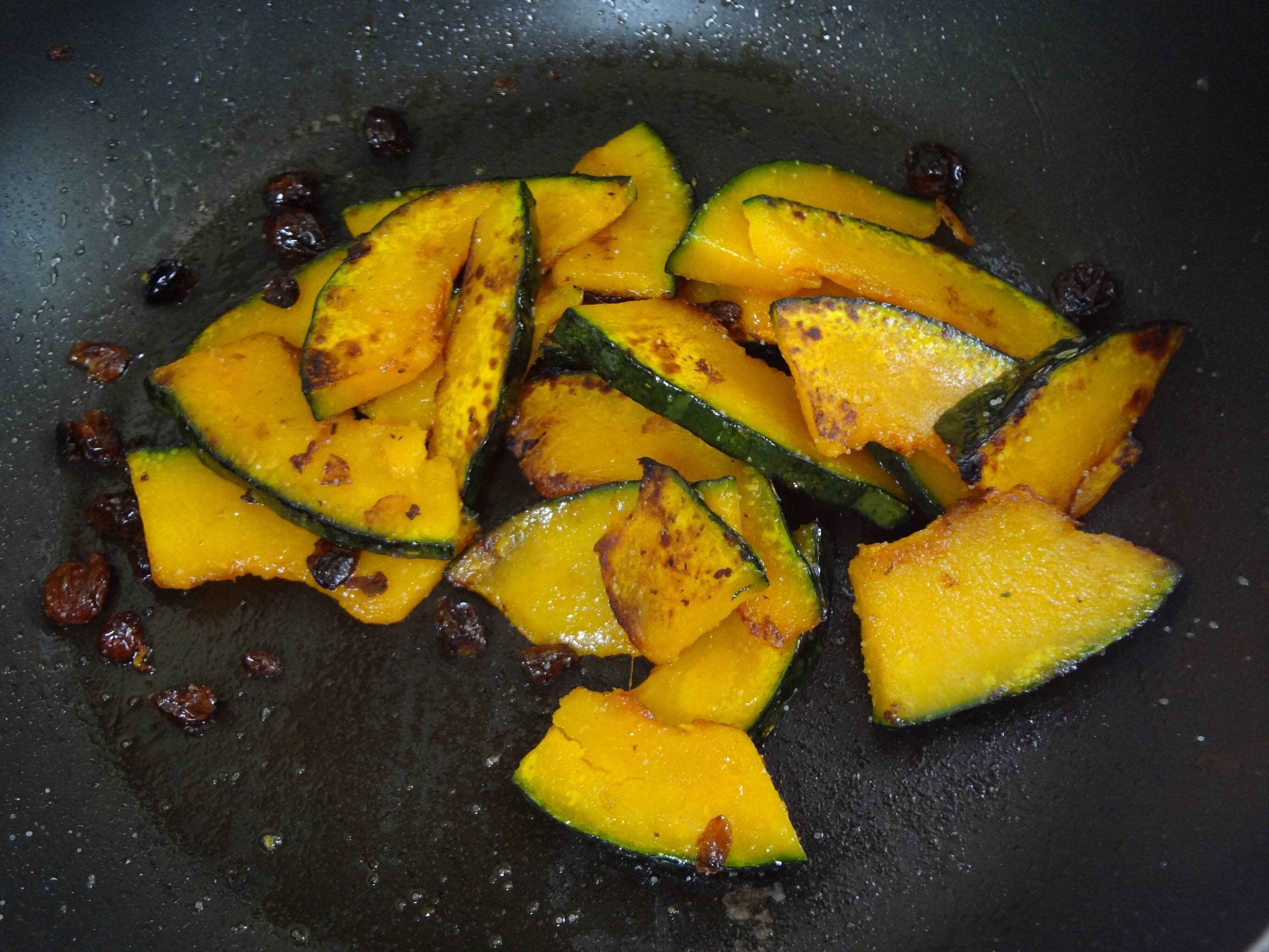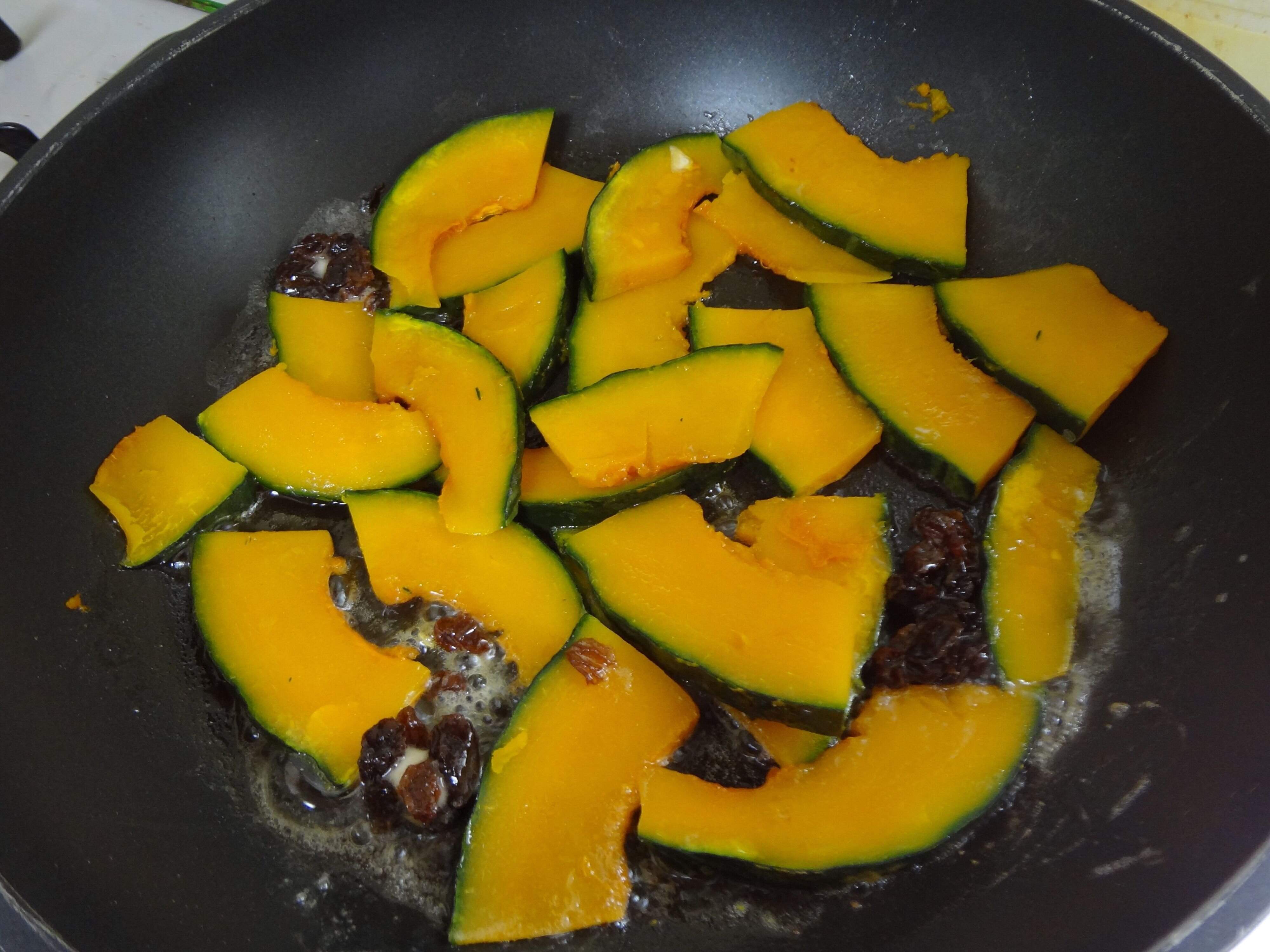 2.フライパンにバターを入れて溶かし、かぼちゃとレーズンを炒めます。
