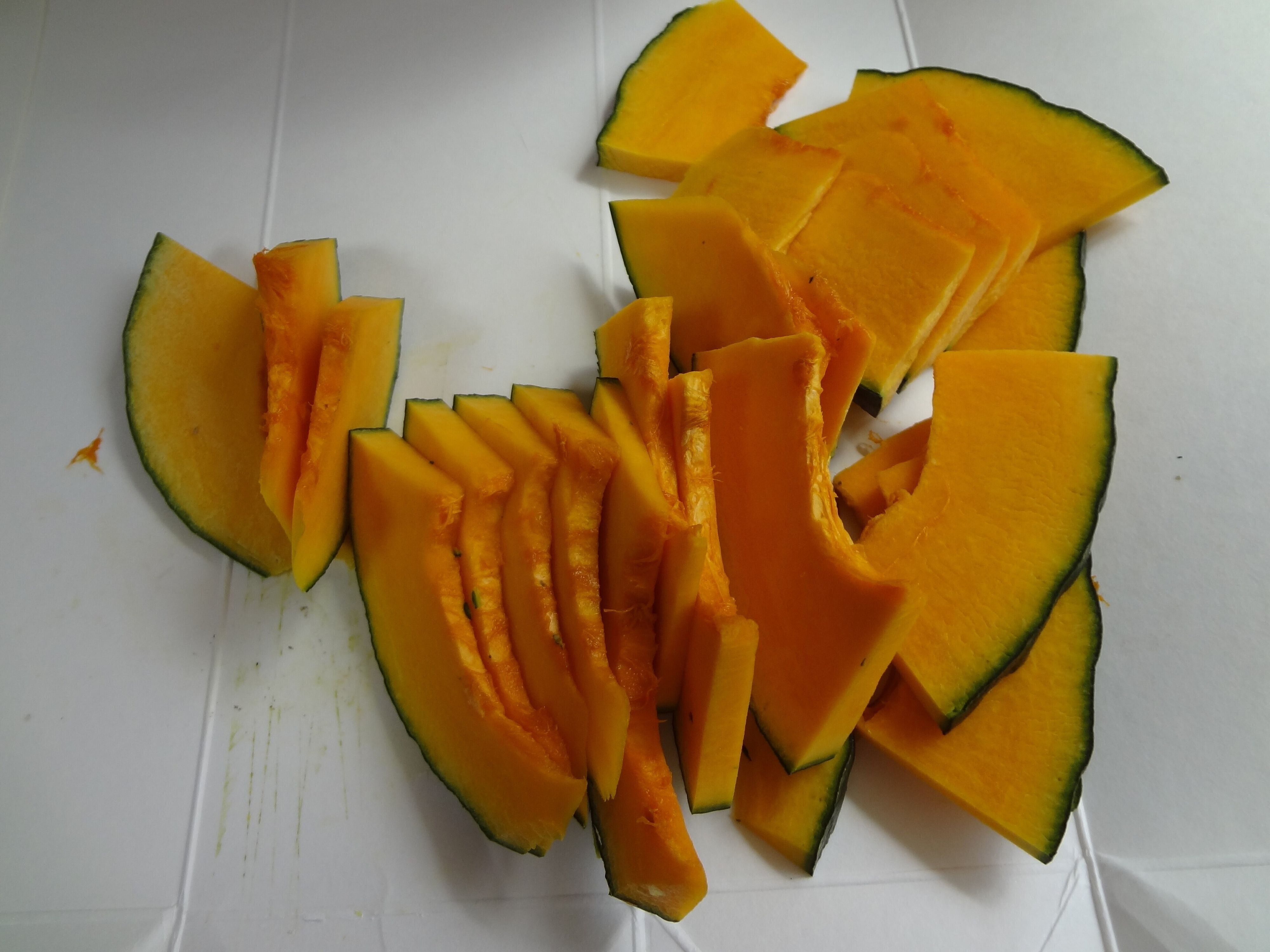 1.かぼちゃは5mmくらいの厚さに切ります。耐熱容器に入れ、ふんわりラップをかけて電子レンジ600wで2分加熱します。