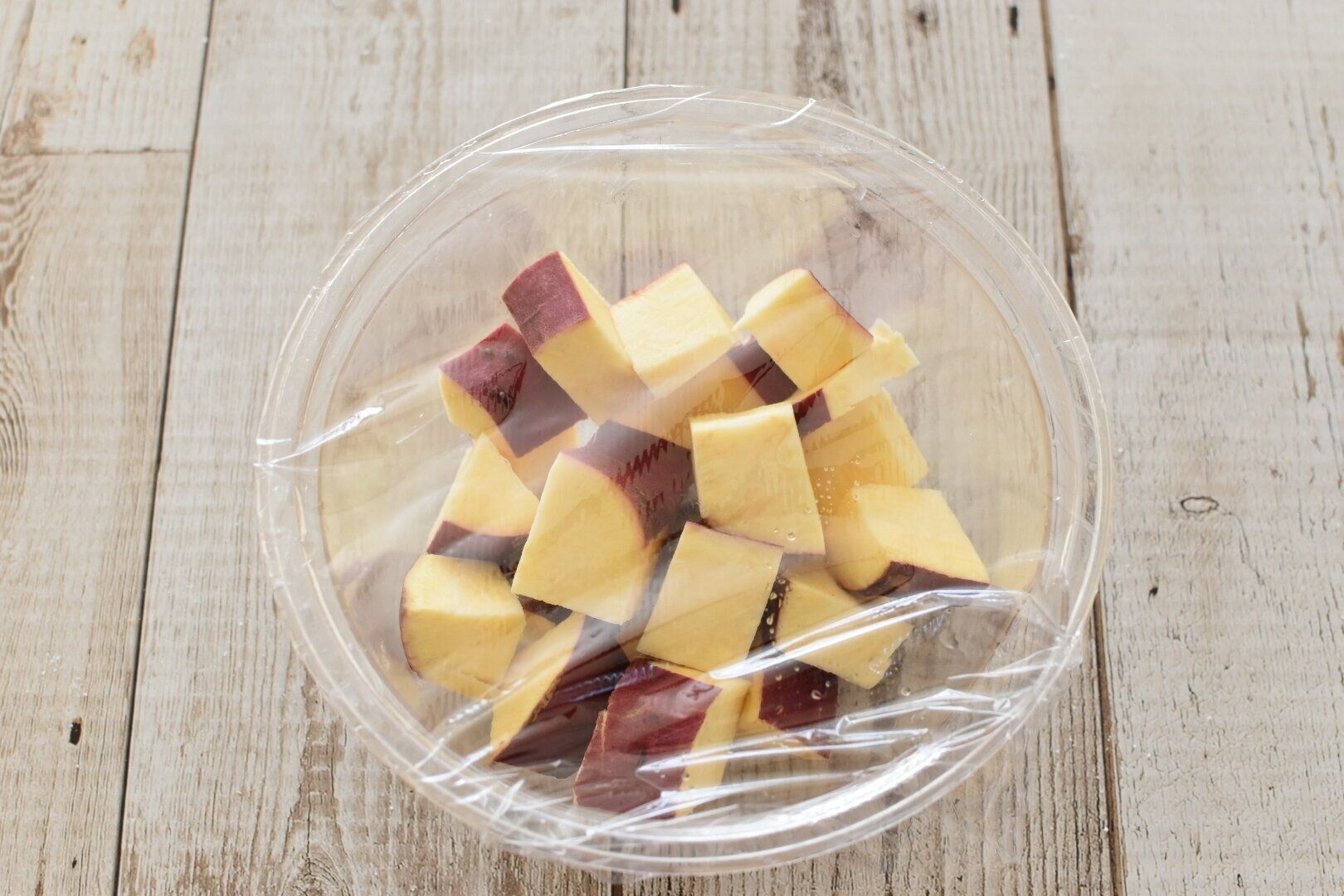 さつまいもは食べやすいサイズにカットし、水ででんぷんを洗い流して耐熱容器に入れる。