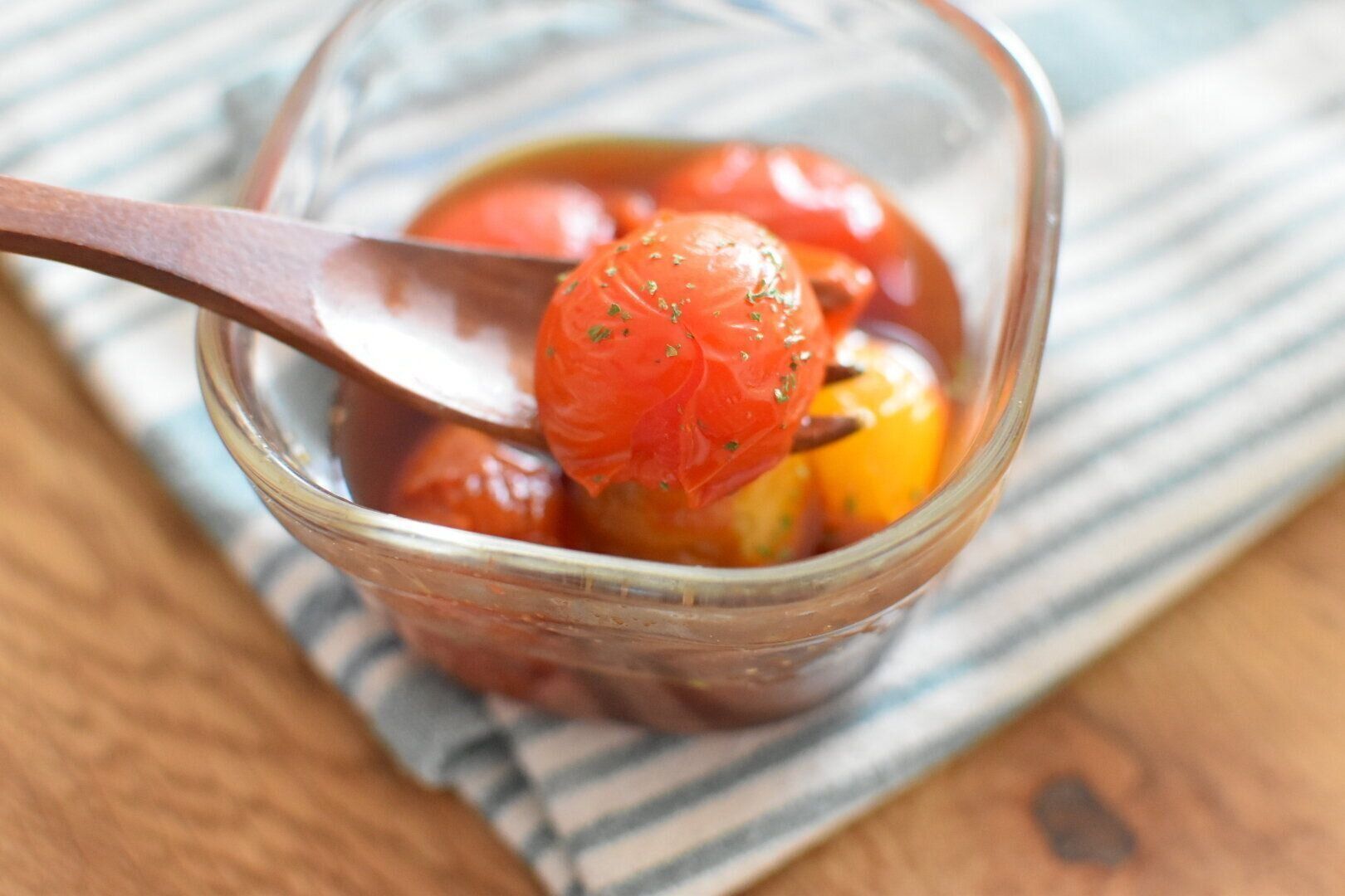1.プチトマトにめんつゆをかけて電子レンジで1分ほど加熱するだけ