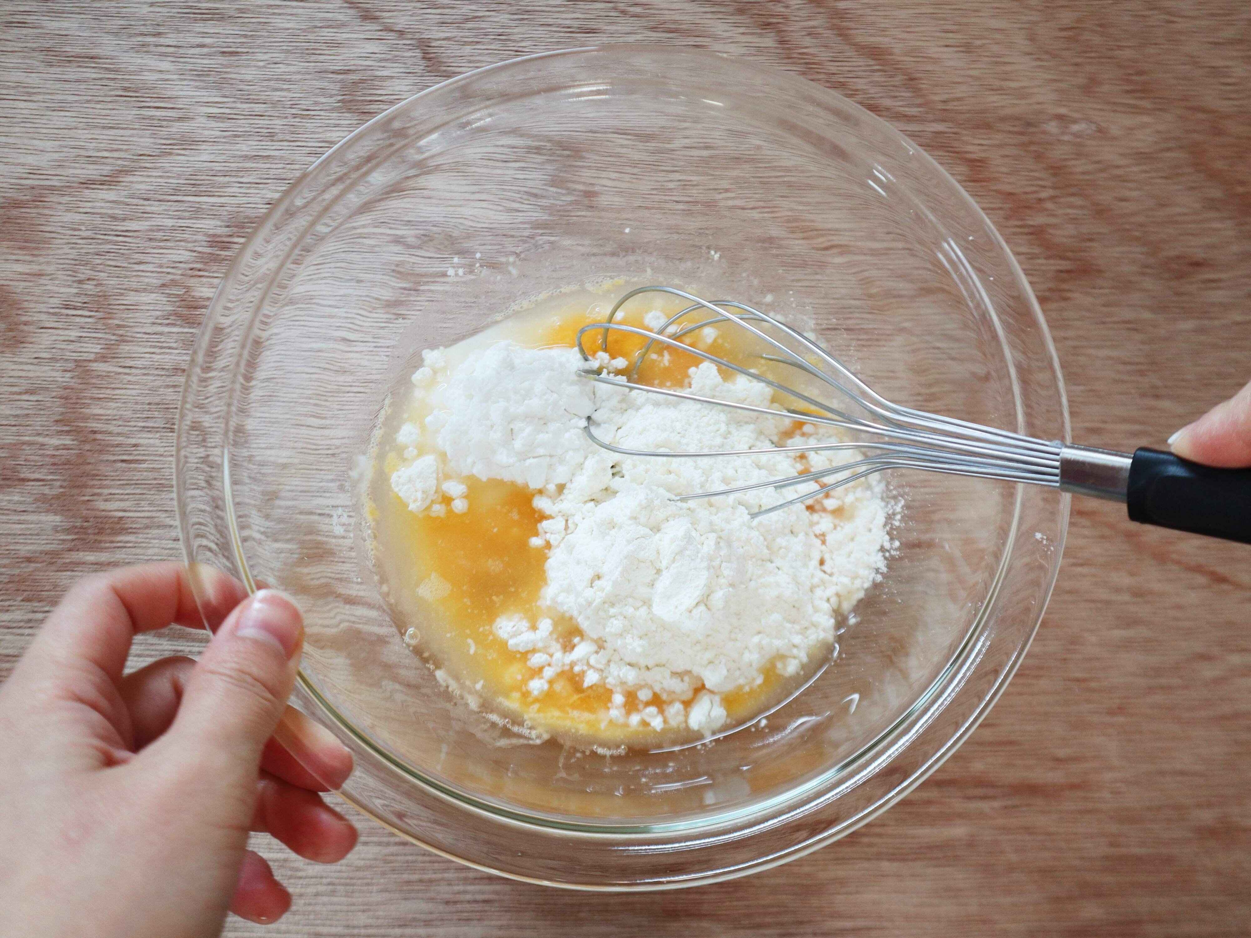 (2) ボウルに卵を溶き、薄力粉・片栗粉・鶏がらスープの素・水を加えて混ぜ合わせる。