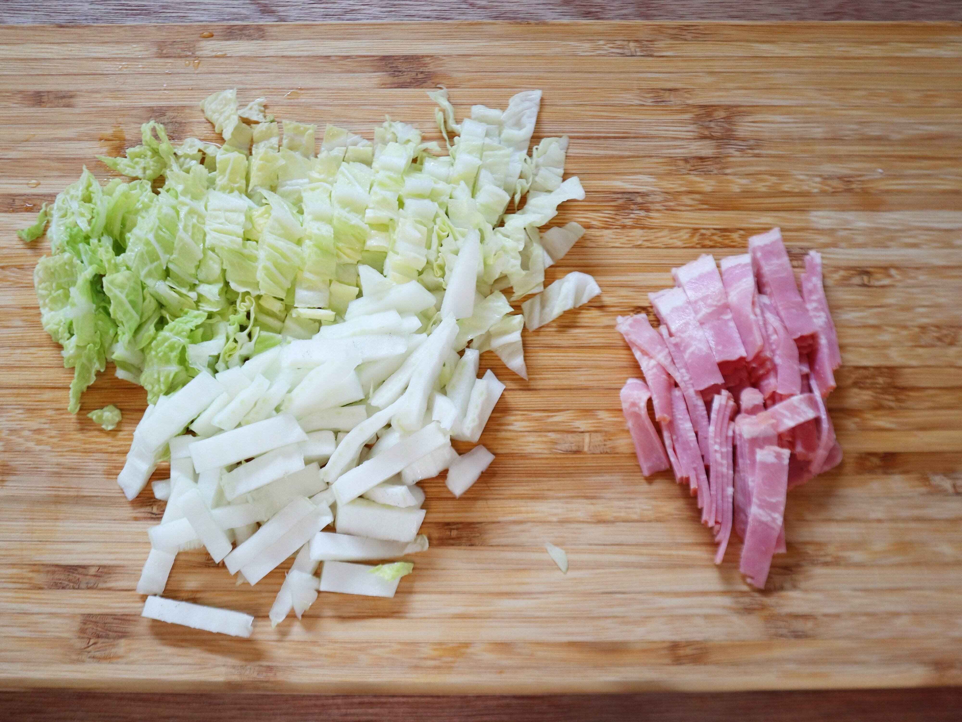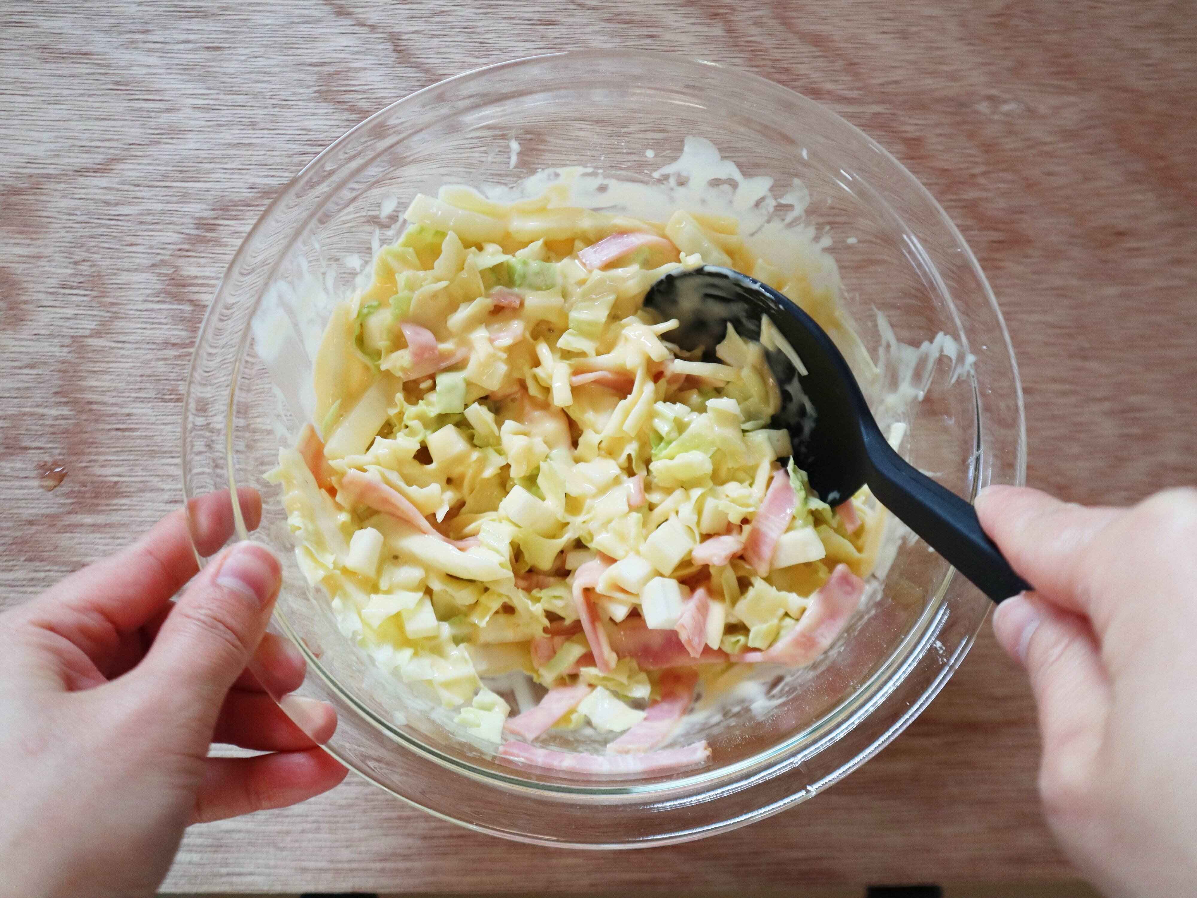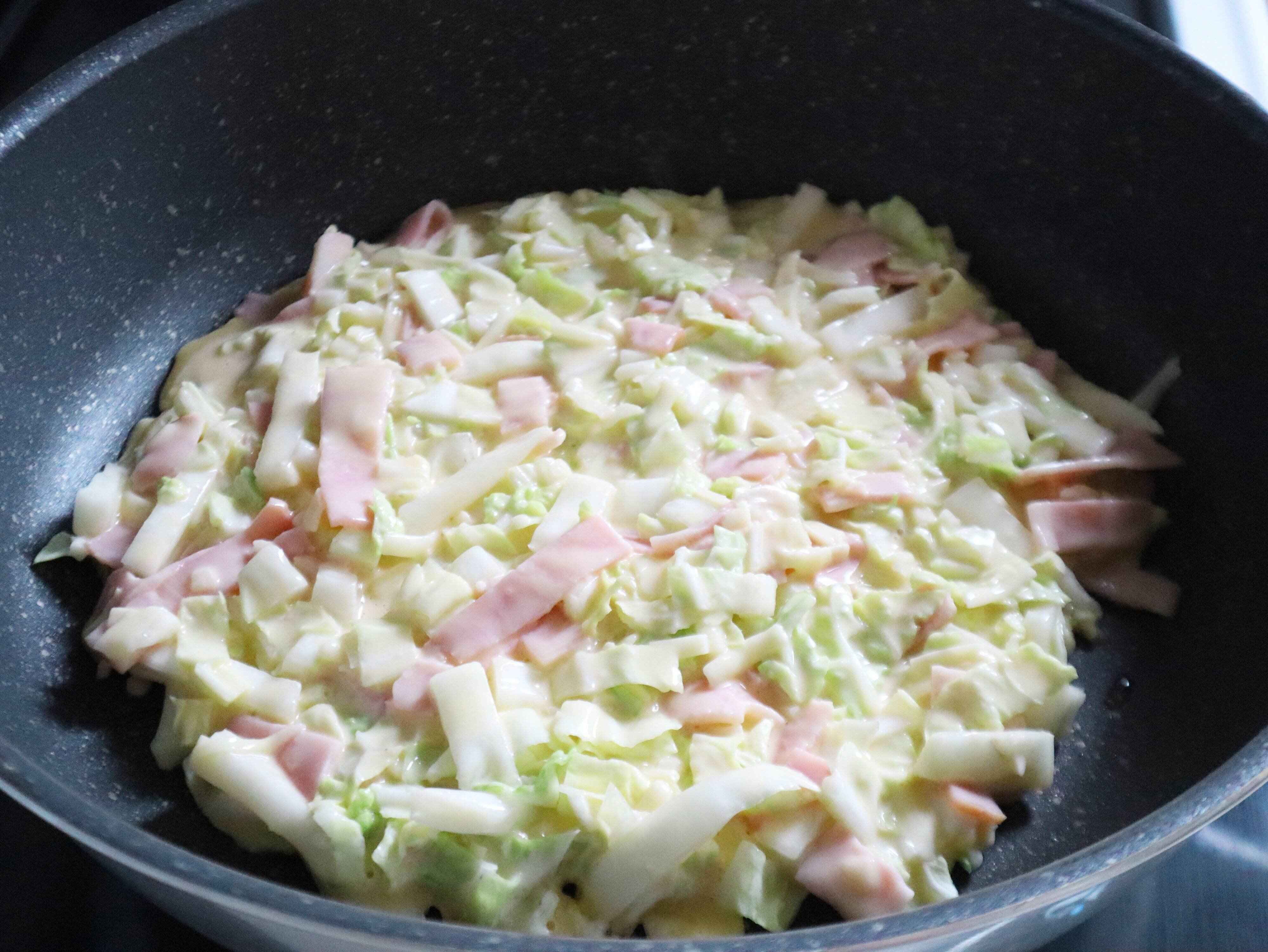 (3) カットした白菜とベーコン・ピザ用チーズを加えて、混ぜ合わせる。