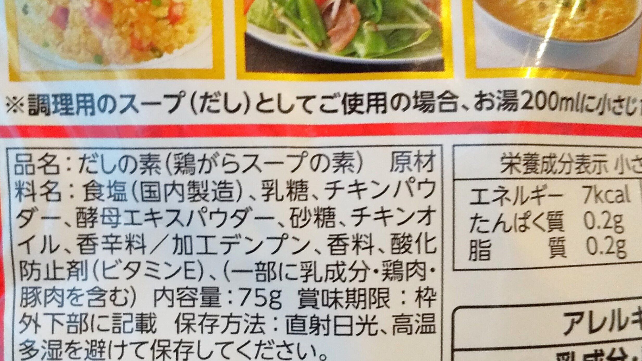 実際に、筆者の手元にあった市販の鶏がらスープの素の原材料を確認してみると、