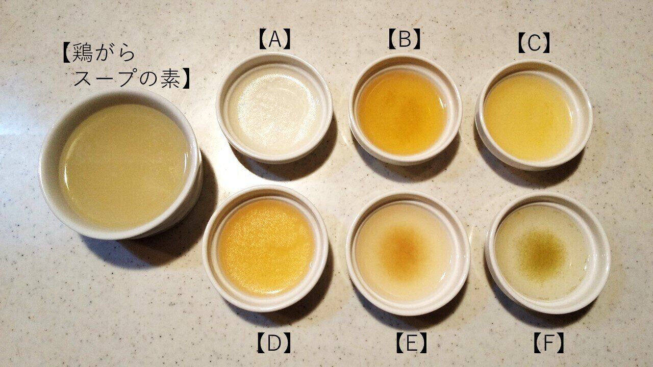 見た目に付いては、【C】【D】がいちばん鶏がらスープの素に近い色となりました。