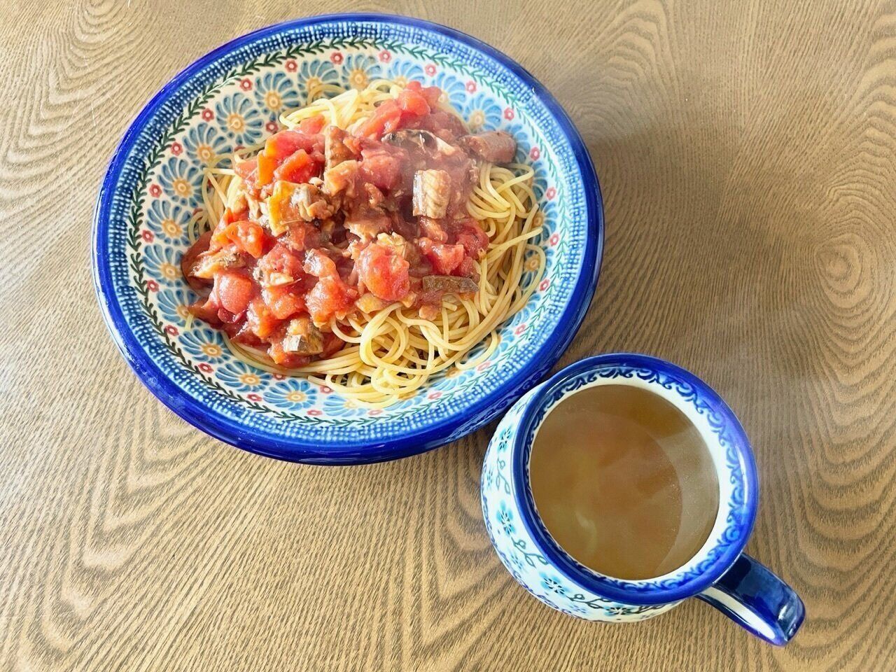 パスタのゆで汁にコンソメを少し溶かし玉ねぎや人参を加えれば、つけ合わせのスープが簡単にできてしまいます。