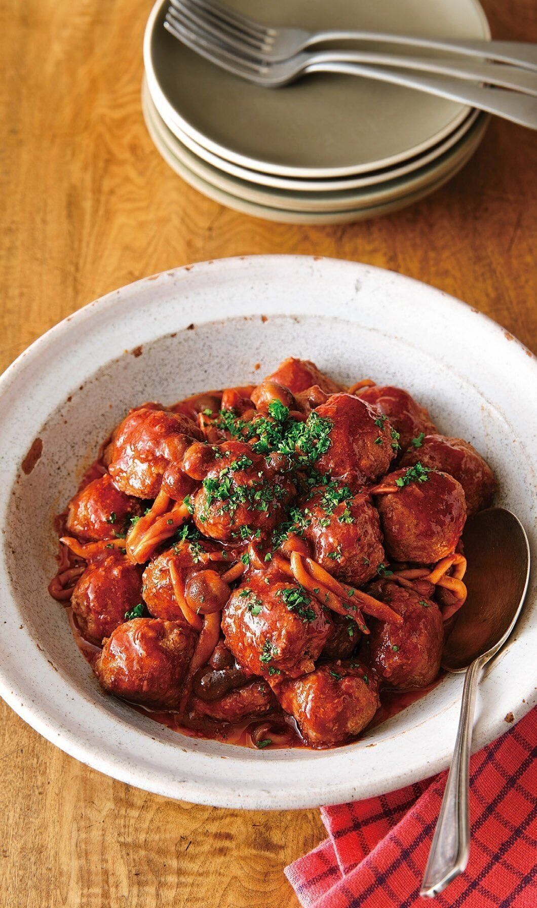 いつものきのこを炒めたソースで、ふわふわミートボールがランクUP!