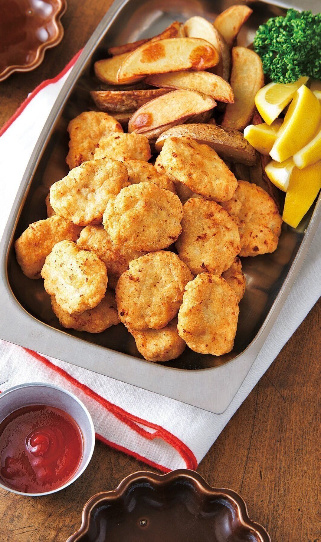 フライパンに油を深さ2cmほど注いで(1)を入れ、中火にかける。時々返しながらじゃがいもが浮いてくるまで約10分揚げる。強火にしてカリッとするまで7~8分揚げ、油をきって塩小さじ1/4をふる。油を中温(170度)に熱し、(2)を入れ、時々返しながら約5分揚げる。フライドポテトとともに器に盛り、ケチャップ、パセリ、レモンを添える。